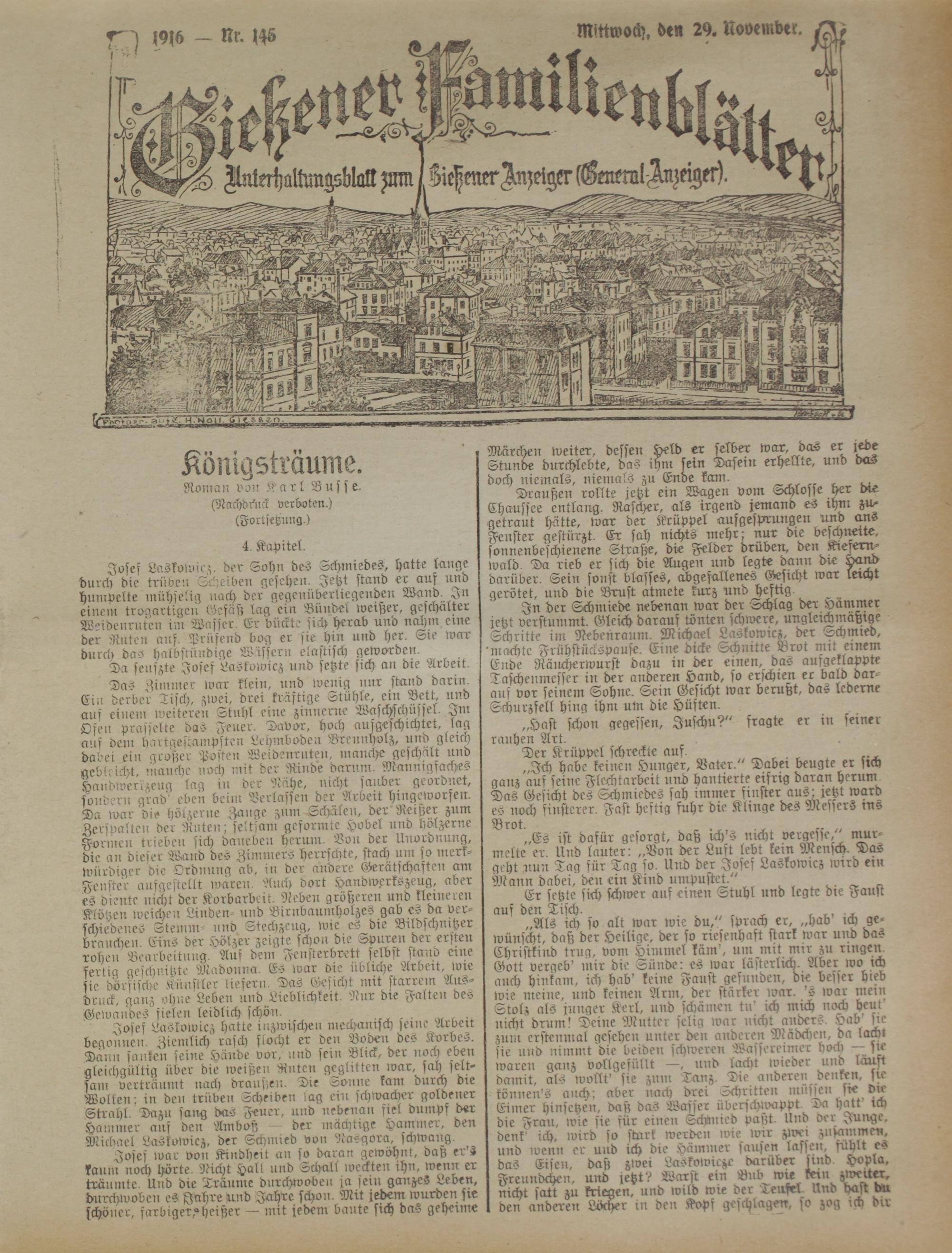 Josef Laskowicz hatte inzwischen mechanisch ferne Arbeit begonnen. Ziemlich rasch flocht er den Boden des Korbes. Dann sanken seine Hände vor, und sein Blick, der noch eben gleichgültig über die weißen Ruten geglitten war, sah seltsam verträumt nach draußen. Die Sanne kant durch die Wollen: in den trüben Scheiben !ag ein schwacher goldener Strahl. Dazu sang das Feuer, und nebenan fiel dumpf der Hammer auf den Amboß der mächtige Hanrmer, den