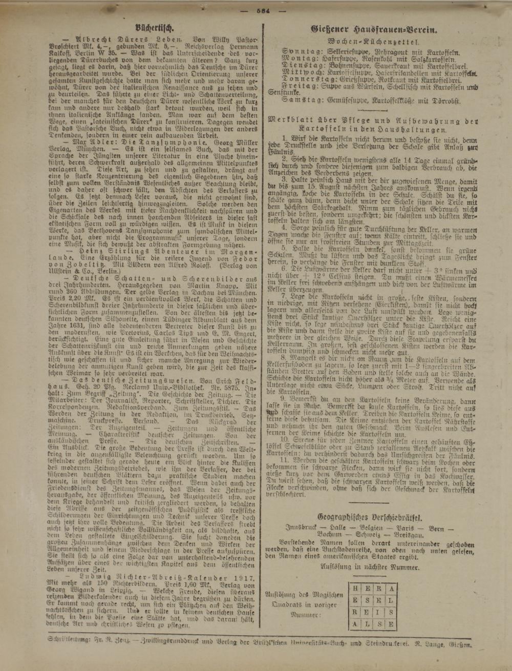Merkblatt über Pflege und Aufbewahrung der Kartoffeln in den Haushaltungen.