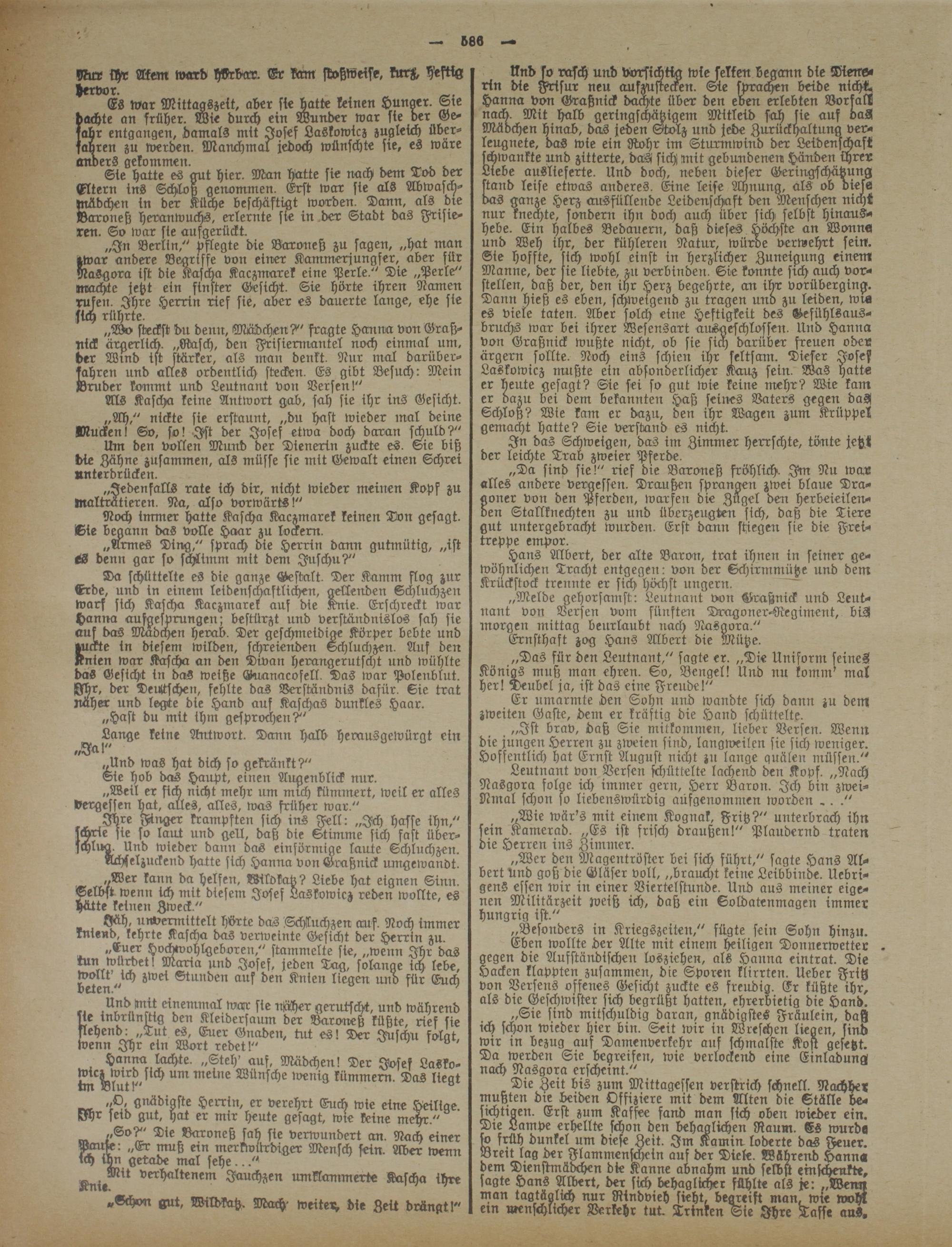 „In Berlin," vflegte die Baroneß zu sagen, „hat man zwar andere Begriffe von einer Kammerjungfer, aber für NaSgora ist die Kascha Kaczmarek eine Perle." Die „Perle" machte jetzt ein finster Gesicht. Sie hörte ihren Namen rufen. Ihre Herrin rief sie, aber es dauerte lange, ehe sie sich rührte.