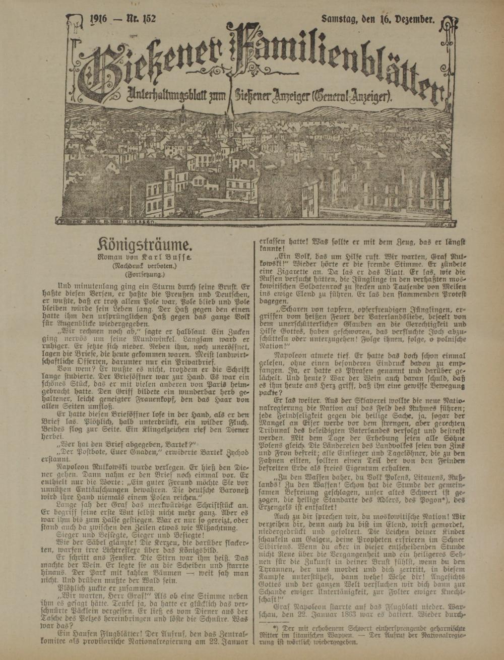 „Zu den Waffen daher, du Volk Polens, Litauens, Rußlands! Zu den Waffen! Schon hat die Stunde der gemeinsamen Befreiung geschlagen, unser altes Schwert ist gezogen, die heilige Standarte des Adlers, des Pogon*), des Erzengels ist entfaltet!