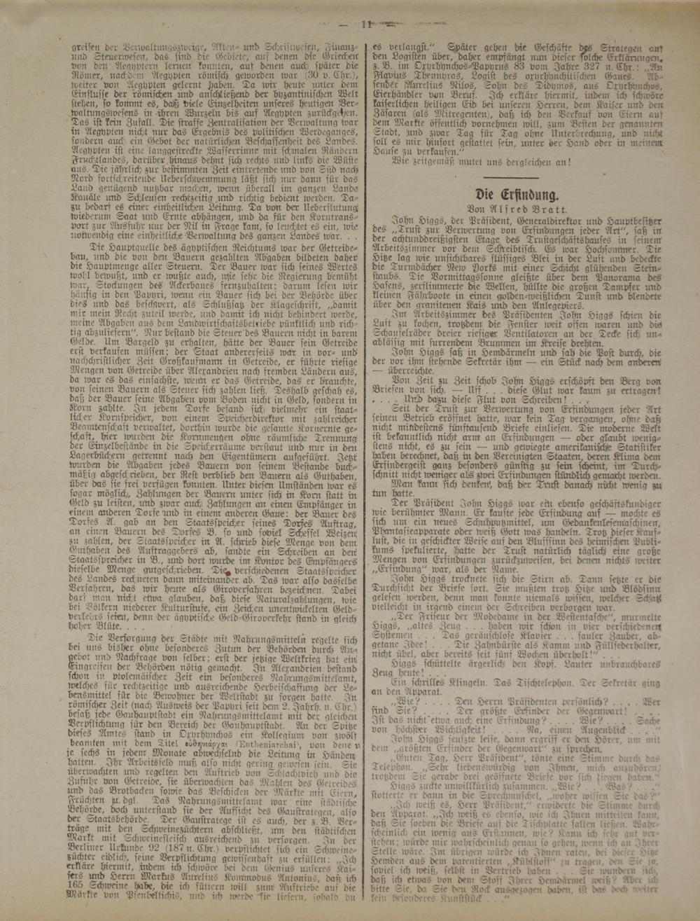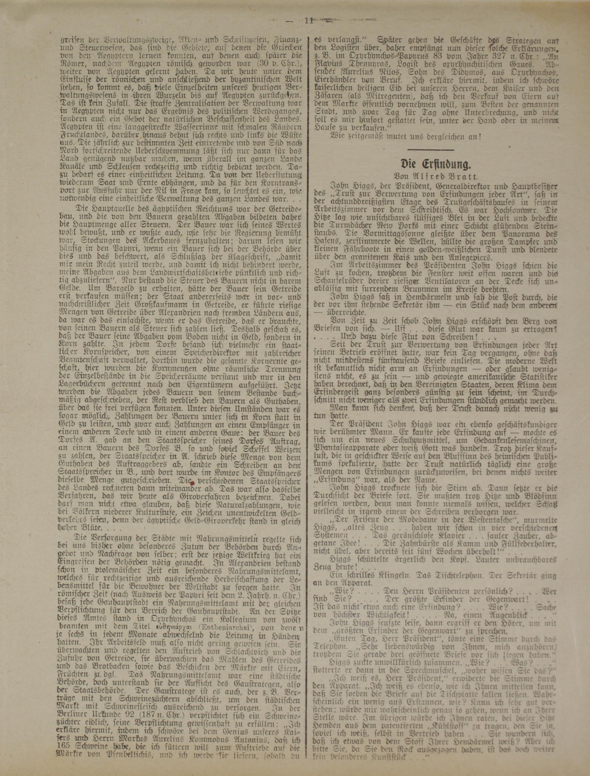 Ter Präsident John Higgs rvar ein ebenso geschäftskundiger wie berühmter Mann. Er kaufte jede Erfindung auf — mochte es sich um ein neues Schuhputz mittel, um Gedankenlesemaschinen, Phantasieapparate oder weiß Gott loas handeln. Trotz dieser Kauflust, die in geschickter Weise auf den Bluffsinn des heimischen Publikums spekulierte, hatte der Trust natürlich täglich eine große Mengen von Erfindungen zurückznweisen, bei denen nichts rveiter „Erfindung" war, als der Name.