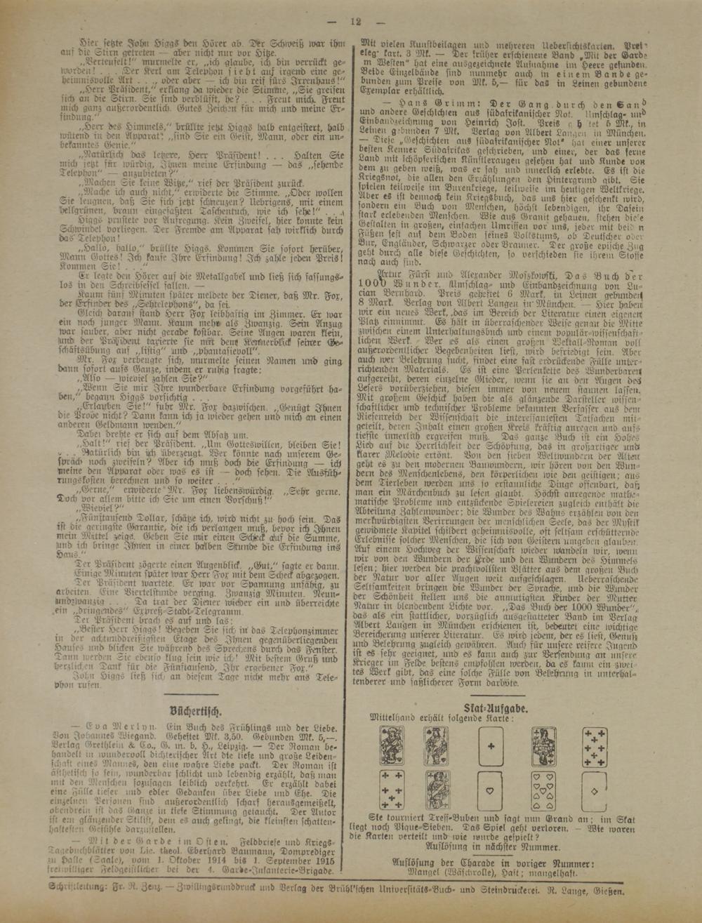 Artur Fürst und Alexander Moszkowski, Das Buch 5er 1.0 0^) W " nder. sUmschlag- und Einbandzeichnung von Lu- cran Bernhard. Preis geheftet 6 Mark, in Leinen gebündelt 8 Mark. Verlag von Albert Langen in' München. - Hier haben wir ein neues Werk, .das im Bereich der Literatur einen eigenen! Platz entnimmt. Es hält in überraschender Weise genau die Mitte zwischen einem Unterhaltungsbtlch unb einem populär-wissenschaftlichen Werk. Wer ,es als einen großen Weltall-Roman voll außerordentlicher Begebenheiten liest, wird befriedigt sein. Aber auch wer Belehrung flicht, findet eine fast erdrückende Fülle unterrichtender Materials. Es ist eme Perlenkette des Wunderbares aufgereiht, deren einzelne Glieder, iveun sie an den Augen brt Lesers vorüberziehen, diesen immer von neuem staunen lassen, Mit großenr Geschick haben die als glänzende Darsteller wissenschaftlicher imd technischer Probleme bekannten Verfasser aus dem Riesenreich der Wissenschaft die interessantesten Tatsachen mitgeteilt, deren Inhalt einen großen Kreis kräftig anregen und aufs tiefste iimerlich ergreifen muß. Das ganze Buch ist ein Hohes Lied auf die Herrlichkeit der Schöpfung, das in großartiger und, klarer Melodie ertönt. Bon den sieben Weltwundern der Alten geht es zu den modernen Bauivundern, wir hären von den Wun dern des Menschenlebens, den körperlichen ivie den geistigen: aus dem Tierleben werden uns so erstaunliche Dinge offenbart, daß man ein Märchenbuch zu lesen glaubt. Höchst anregende mathematische Probleme und entzückende Spielereien zugleich enthält die Abteilung Zahlenwunder; die Wunder des Wahns erzählen von den merkwürdigsten Verirrungen der menschlichen Seele, das der Mystik gewidmete Kapitel schildert geheimnisvolle, oft seltsam erschütternde Erlebnisse solcher Menschen, die sich von Geistern umgeben glauben. Auf einem frochiveg der Wissenschaft wieder wEndetn ivir, ivenn wir von den Wundern der Hrde imd den Wundern des Himmels lesen: hier werden die prachtvollsten Blätter aus dem großen Buch der Natur vor aller Augen weit anfgeschlagen. Ueberrascheudr Seltsamkeiten bringen die Wunder der Sprache, und die Wmrder der Schönheit stellen uns die annrutigsten Kinder der Mutter Natur in blendendem Lichte vor. „Das Buch der 1000 Wunder",, das als ein stattlicher, vorzüglich ausgestatteter Band im Verlag Albert Langen in Münchetr erschienen ist, bedeutet eine wichtige Bereicherung unserer Literatur. Es wird jedem, der es liest, Genuß und Belehrung zu-gleich gewähren. Auch für unsere reifere Jugend ist es sehr geeignet, und es kamt auch zur Versendtmg an unsere Krieger im Felde bestens empfohlen werden, da es kaum ein zwei tes Werk gibt, das eine solche Fülle von Bekehrung in unterhaltenderer und faßlicherer Form darMe.