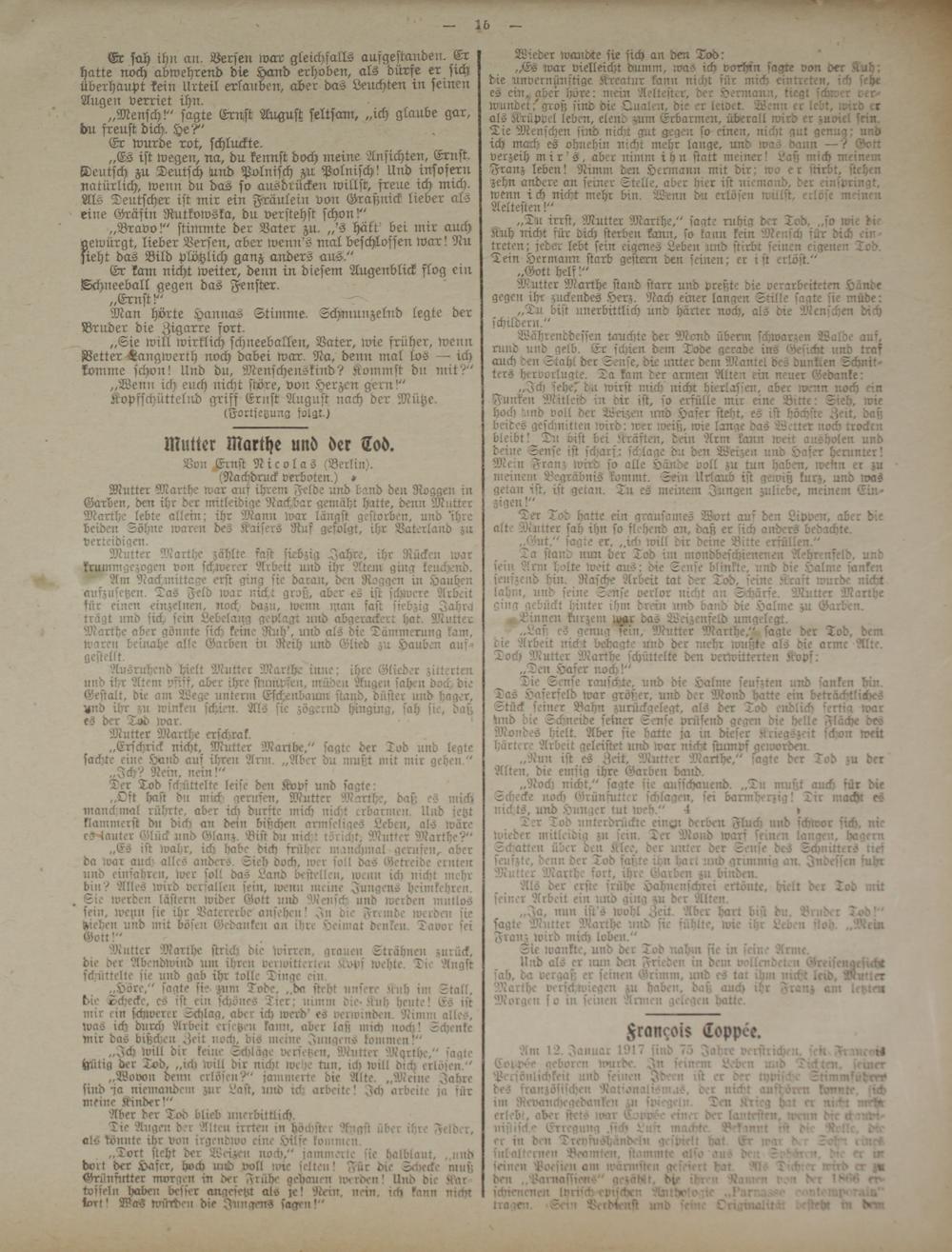 Am 12. Januar 1917 sind 75 Jahre verstrichen, sek Frrue^rs Coppöe geboren wurde. In seinem Leben und Diäten, seiner Persönlichkeit und seinen Ideen ist er der typische Snmmkudni» des französischen Nationalismus, der nickt aufhören konnte, 'ich im Revanckjegedonken su spiegeln. Den Krieg hur er nickt mrtn erlebt, aber stets uwr Eovvöe einer der lautesten, trenn drc chunrn instische Erregung .sich Lun machte. Bekannt ist die Nette. d?e er in den Drennishandeln gespielt bat Er war Kr Sohn imrf subalternen Beamten, stammte -also aus den Svk-n K. er ut seinen Poesien am wärmsten gefeiert dar :'tt Tufvrr wird er z» den ..Parnafsiems" gezählt, die ihren Rainen iv* Kr m-