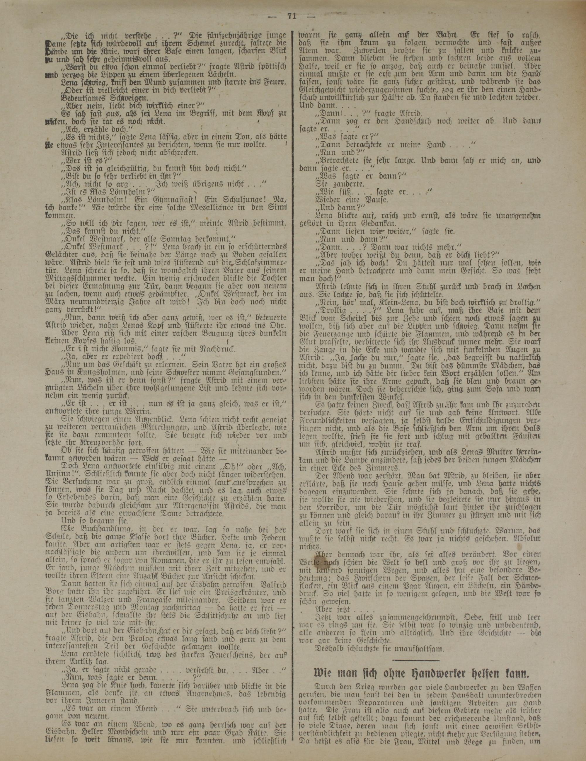 Doch Lena antwortete einsilbig .mit einen; „Oh!" oder „Ach, Unsinn!". Schließlich konnte sie aber doch nicht länger widerstehen. Tie Versuchung war zu groß, endlich einmal lauttonssprechen zu können, 'was sie Tag und Nacht dachte', und es lag auch etwas so Erhebendes darin, daß man eine Geschichte zu erzählen hatte. Sie wurde dadurch gleichsam.zur Mtergenossin Astrids, die man ja bereits als eine erwachsene Dame betrachtete.