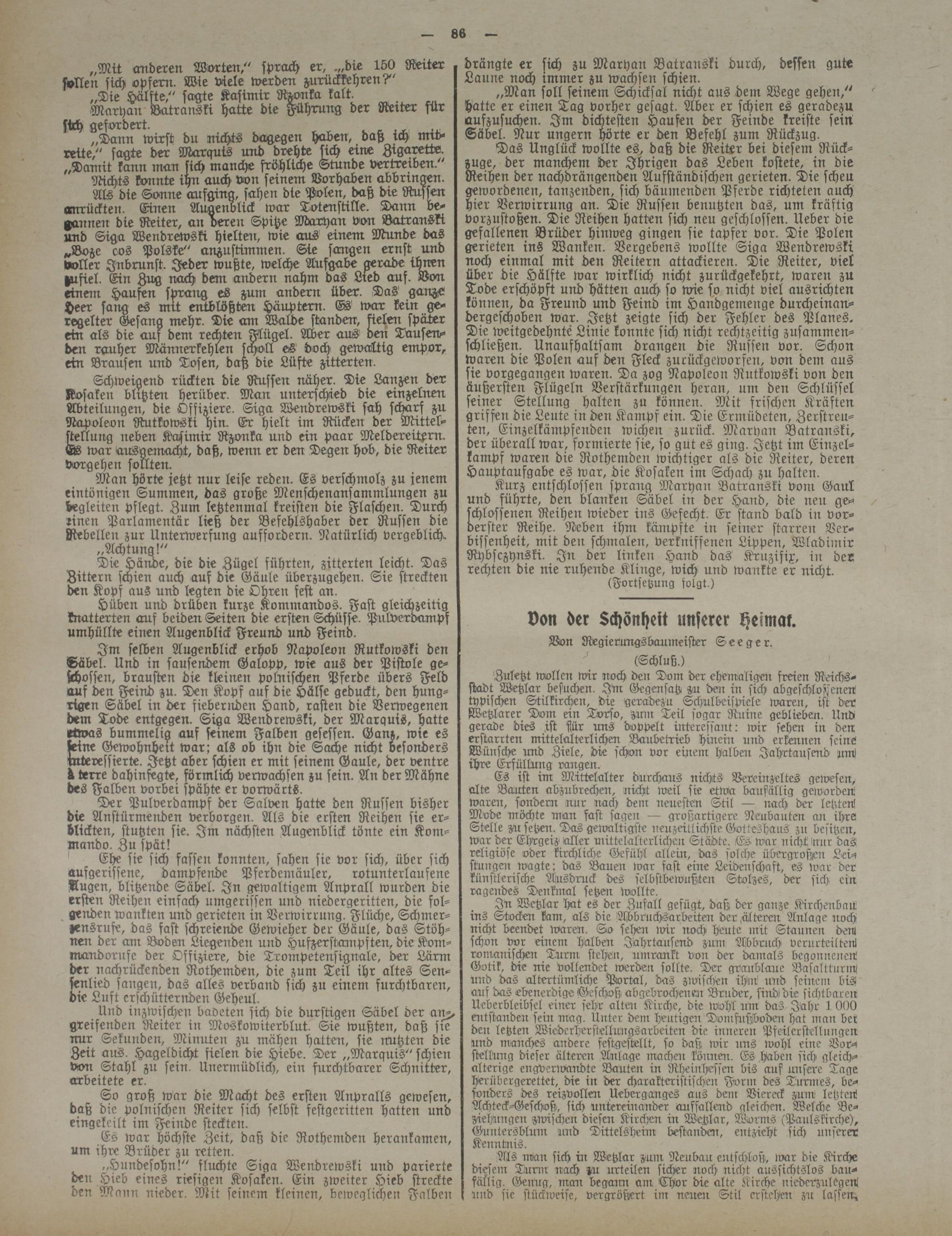 Als die Sonne aufging, sahen die Polen, daß die Russen omrückten. Einen Augenblick war Totenstille. Dann begannen die Reiter, an oeren Spitze Maryan von Batranski und Siga Wendrewski hielte::, wie aus einem Munde das „Boze oos Polske" anzustimmen. Sie sangen ernst und voller Inbrunst. Jeder wußte, welche Aufgabe gerade ihnen Iusiel. Ein Zug nach dem andern nahm das Lied aus. Bon einen: Haufen sprang es zum andern über. Das ganze Heer sang es mit entblößten Häuptern. Es war kein geregelter Gesang mehr. Die am Walde standen, sielen später ein als die auf dem rechten Flügel. Aber aus' den Tausend den rauher Männerkehlen scholl es doch gewaltig empor, ein Brausen und Dosen, daß die Lüfte zitterten.