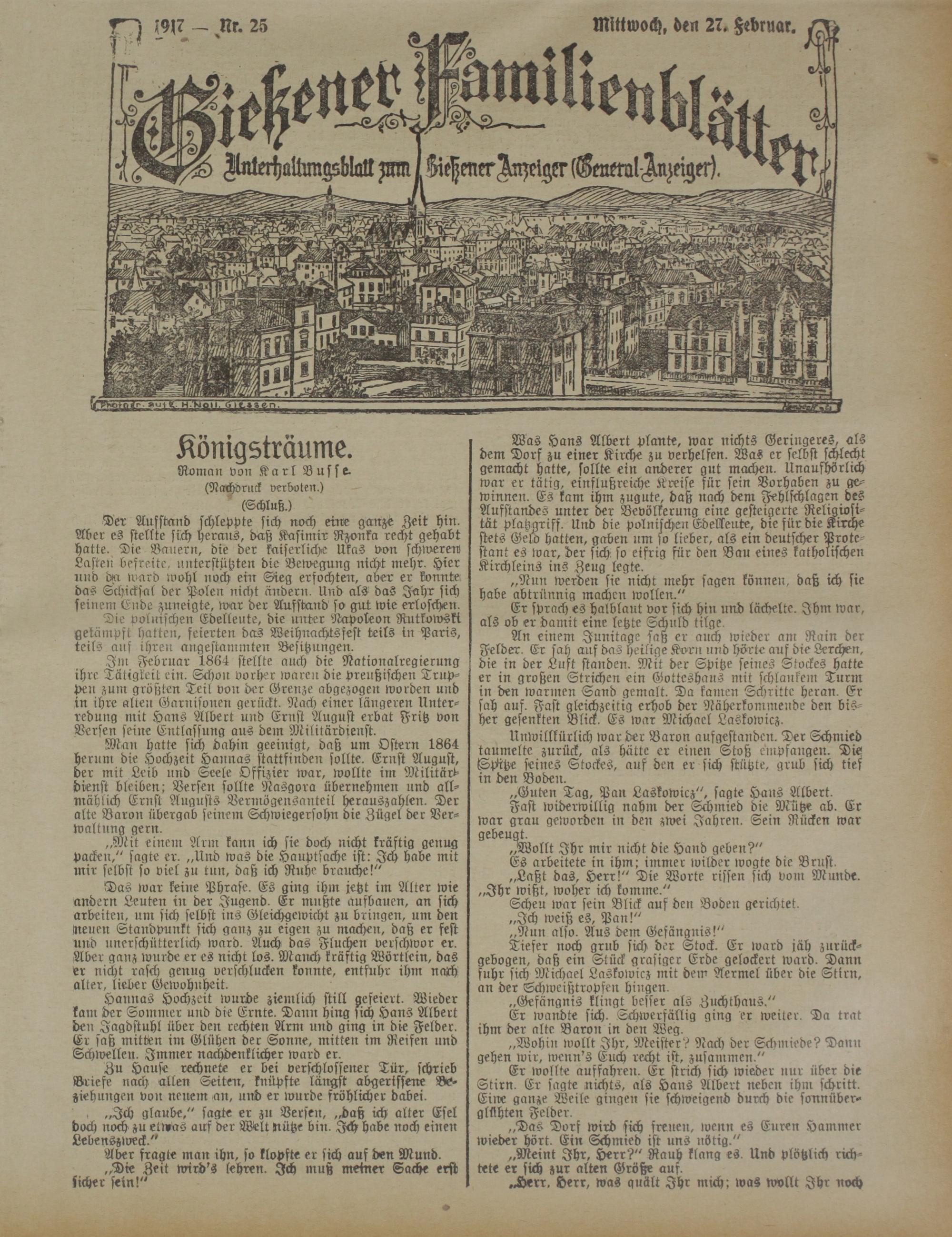 An einem Junitage saß er auch wieder anr Rain der Felder. Er sah ans das heilige Korn und hörte auf die Lerchen, die in der Luft standen. Mit der Spitze seines Stockes hatte er in großen Strichen ein Gotteshaus mit schlankem Turm in den warmen Sand gemalt. Da kamen Schritte heran. Er sah auf. Fast gleichzeitig erhob der Näherkommende den bisher gesenkten Blick. Es war Michael Laskowicz.