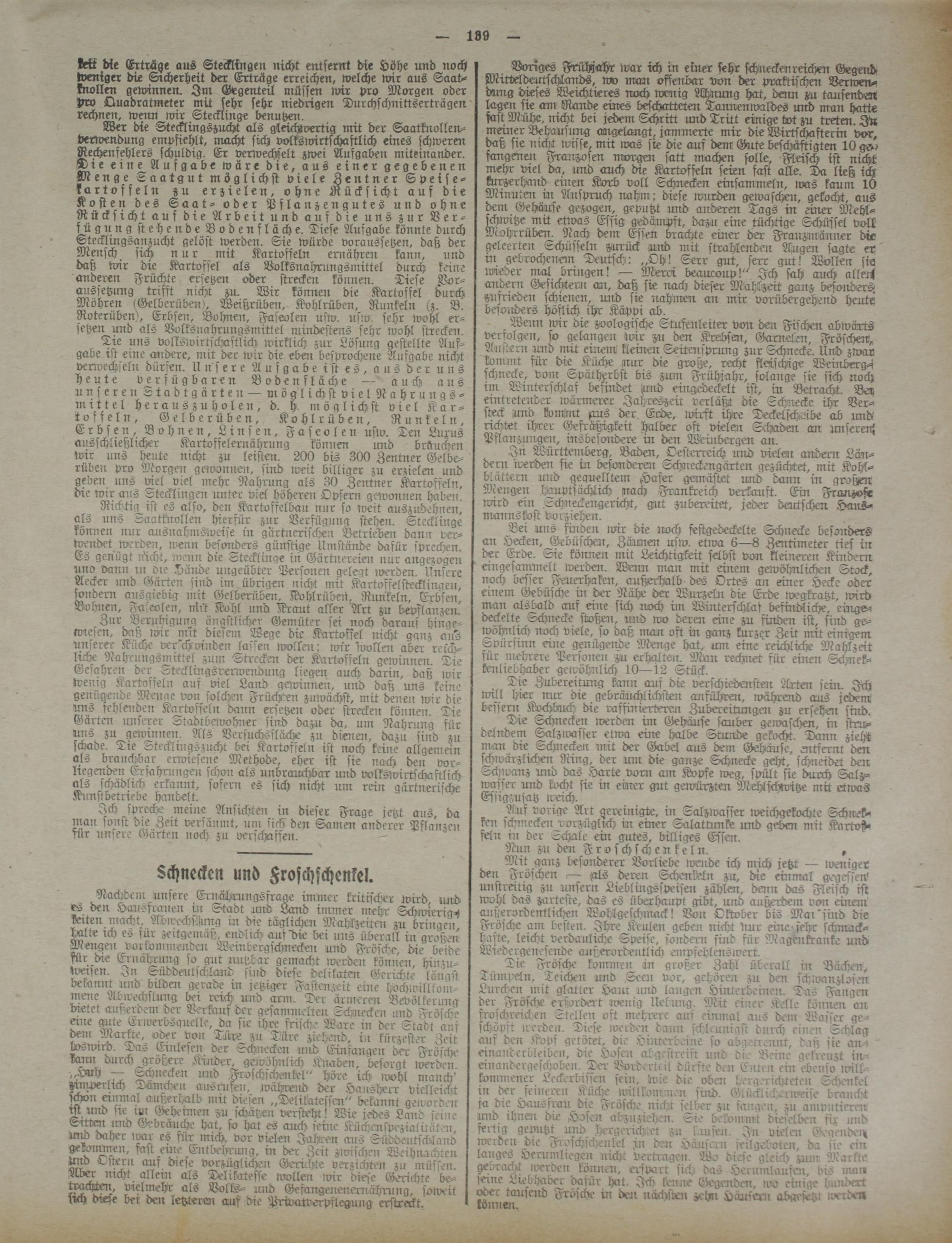 dkachdem unsere Ernährungsfrage immer kritischer wird und es den Hausfrauen fti Stadt imd Land immer mehr Schnnerig^ «eiten macht, WtvechMmg in die täglichen Mahlzeiten zu bringen halte ich es für zeitgemäß, endlich ans'die bei mis überall in großen Mengen vovlommenden Weinbergschnecken und Frösche, die beide für die Ernährung so gut «nutzbar gemacht werden können, hinzu- wi-ersen. ^n Süddeutschland such diese delikaten Gerichte längst bekannt und bilden gerade ut jetziger Fastenzeit eine hochwillkommene Abwechslung bei reich und arm. Der ärmeren Bevölkerung tnetet außerdem der Verkauf der gesammttren Schnecken und Frösche eure gatte Er,verbsquelle, da sie ihre frische Ware in der Stadt auf dem Markte oder vmi Tür^zu Türe ziehend, in kürzester Zeit ko^wiw. Einlesen der schriecken uiiü Einfangen der Frösch- «mm durch größere Kruder, gewöhnlich Knaben, besorgt »verdcn — Schnecken und ^Froschschearkel" höre ich ivohl manch' K-miperlrch Dämchen ausrufeir, während der Hausherr vielleicht Ichon einmal außerhalb mit diesen „Delikatessen" bekannt geworden rst. und sie im Gehernien zu schätzen versteht! Wie jedes Land seine Eittmr niid Gebräuche hat, so hat es auch seine Küchenspezialiräten, und daherivar es ftir Mich, vor vielen Jahren aus Süddeutsästand gekommen, mst eure Entbehrung, in der Zeit znckschen Weihnachten Mw Osterli auf diese vorzüglichen Gerichte verzichten zu müssen. Ab^.' Nicht allem als Delikatesse wollen wir diese Gerichte be- twchchen, vielmehr als Volts- und Gefangenenernährirng, soweit Um diese ber den letzteren auf die Privatverpflegung erstreckt.