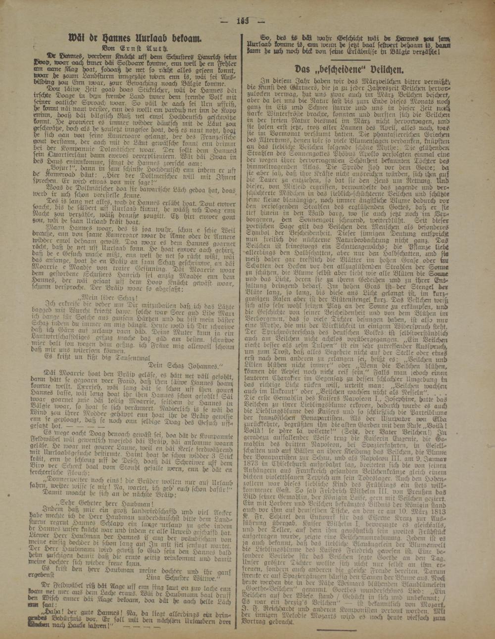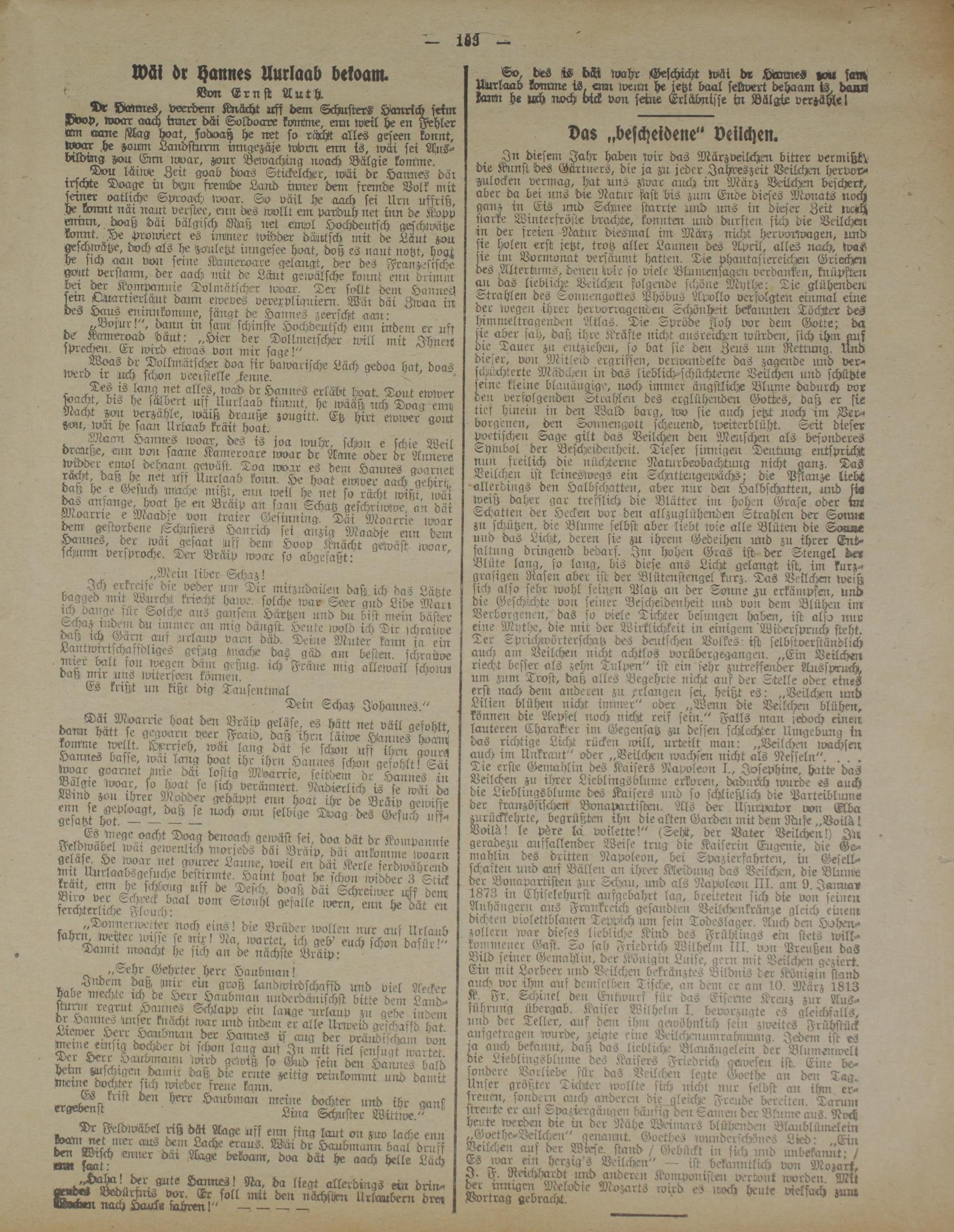 ^ Dr Dann es. veerdem Knächt uff dem Schusters Hanrich seim N»P, woar auch inner däi Soldoave konttne, enn weil he en Fehler «m oxme Mag hoat, sodsaß he net so rächt alles geseen könnt, lwar .he -oum Landsturm sinigezäje wiorn enn is, wai sei Ans- bilding zou Enn woar, zour Bewaching noach Bälgie komme.