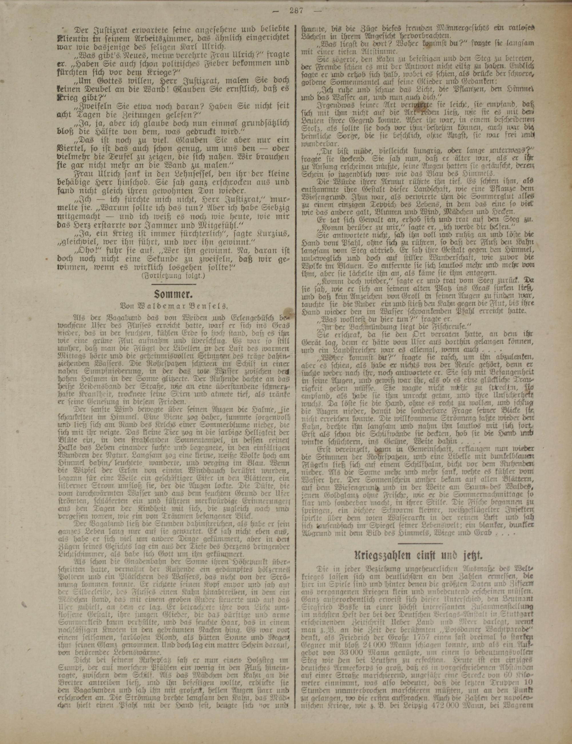 „Mrs gibt's. Neues, meine verehrte Frau Ulrich?" fragte er. „Haben Sie auch schon politisches Fieber bekommen und fürchten sich vor dem Kriege?"
