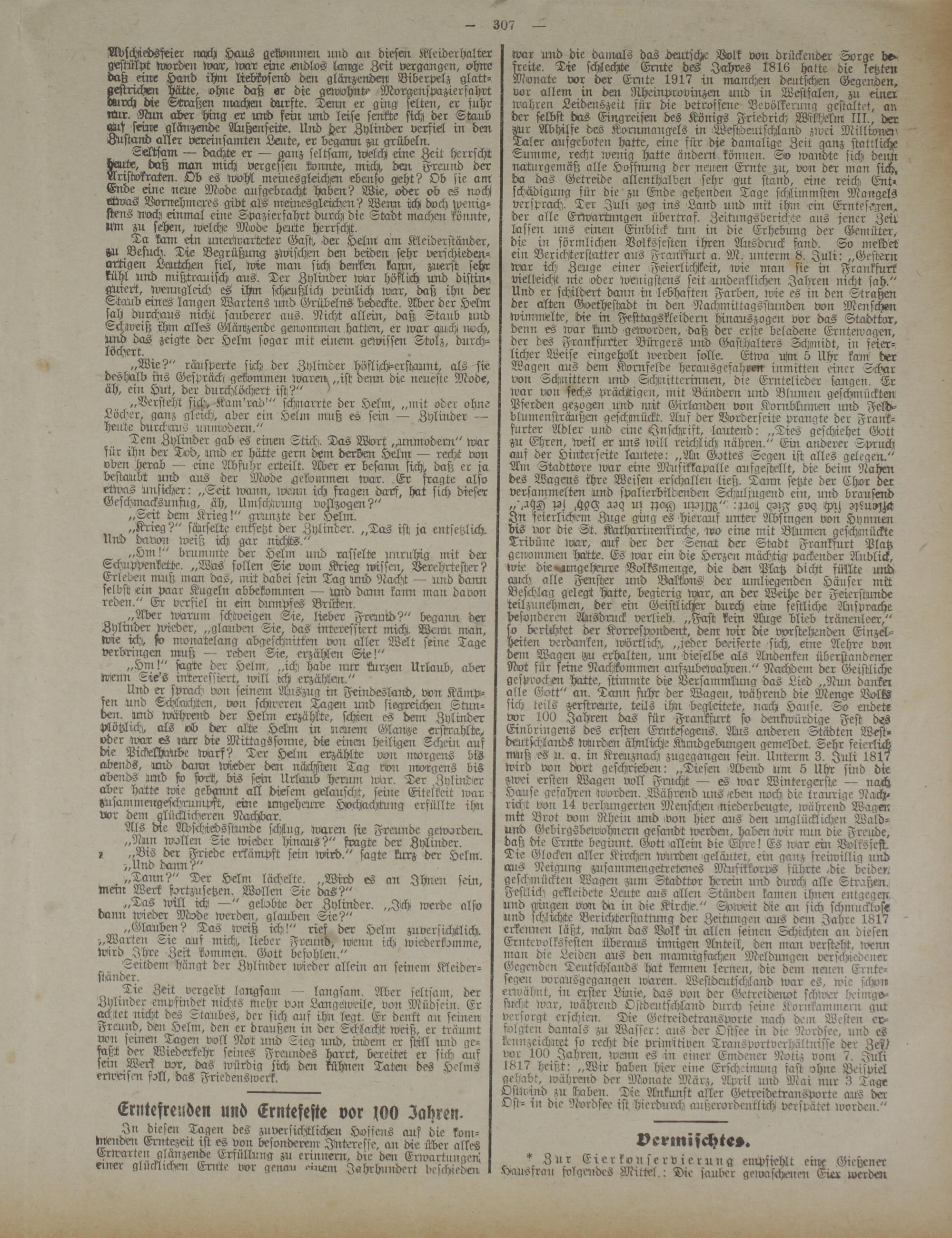 war und die damals das dentschc Volk von drückender Sorge befreite. Tie schlechte Ernte des Jahves 1816 hatte die letzten Monate vor der Ernte 1917 in manchen deutschen Gegenden, vor allem in den Rheinprovinzen uick in Westfalen, zu einer wahren Leidenszett für die betrofferle Bevölkerung gestaltet, an der selbst das Eingreifen des Königs Friedrich Wilhelm HI., der Kr Mhilfe des Kornmangels in Westdeutschland zwei Millionen Taler ausgeboten hatte, eine für die damalige Zeit ganz stattliche Summe, recht wenig hatte ändern können. So lvarckte sich denn naturgemäß alle Hoffnung der neuen Ernte zu, von der man sich, da das Getreide allenthalben sehr gut stand, eine reich Ent» schädigung für die zu Ende gehenden Tage schlimmsten Mangels versprach. Ter Juli zog ins Land mrd mit ihm ein Erntesegen, der alle Erwartungen überttaf. Zeitungsberichte aus jener Zeit, lassen ims einen Einblick tun in die Erhebung der Gemüter, die in förmlichen Volksfesten ihren Ausdruck fand. So meldet ein Berichterstatter aus Frankfurt a. M. unterm 8. Juli: „Gestern war ich Zeuge einer -Feierlichkeit, wie man sie in Frankfurt vielleicht nie -oder wenigstens seit undenklichen Jahren nicht sah." Und er schildert dann in lebhaften Farben, wie es in den 'Straßen der alten Goethestadt irr den Nachmittagsstunden von Menschen wimmelte, die in Festtagskleidern hinanszogen vor das Stadttor, denn es war kund geworden, daß der erste beladene Erntewagen, der des Frankfurter Bürgers mck Gasthalters Schmidt, in feierlicher Weise ein ge holt lverden solle. Etwa Um 5 Uhr kam der Wagen ans dem Kornfelde heransgefahren inmitten einer Schar von Schnittern und Schnitterinnen, die Erntelilcker sangen. Er war von sechs prächtigen, mit Bändern und Blumeii geschmückten Pferden gezogen und mit Girlmcken vor: Kornblumen mtb Fekd- blnmenstr außen geschmückt. Ans der Vorderseite prangte der Frankfurter Adler und eine Anschrift, lautend: „Ties geschehet Gott zu Ehren, weil er uns will reich ich nähren." Ein anderer Spruch auf der Hiltterseite lautete: „An Gottes Segen ist alles gelegen." Aut Stadttore war eine Musikkapelle ausgestellt, die beim Nahen des Wagens ihre Weisen erschallen ließ. Tann setzte der Chor der versammelten und spalierbildenden Schuljugend ein, und brausend ,,'.aD Pl ,(&<$ aoq nr upM": ßvq M ^?noM