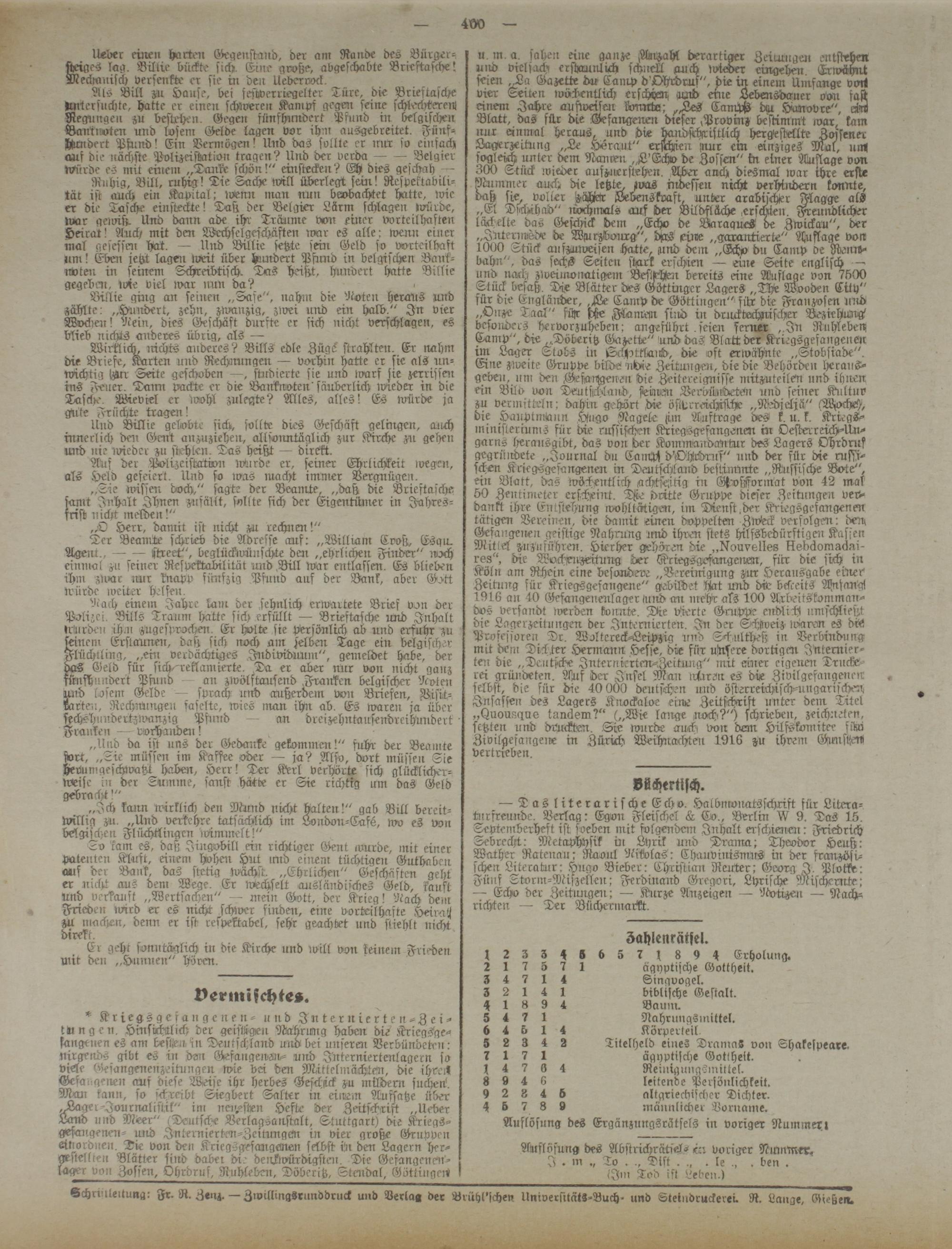 * Kriegsgefangenen- und Internierten -Zeitungen. Hinsichtlich der geistigen Rührung haben die Kriegsgefangenen es am heften, in Deutschland uns bei unseren Verbündet,',,: nirgends gibt es in den Gesaugen-öir- und J'nterniertenlagern so viele (befangenenZeitungen wie bei den Mittelmächte!», die ihreiß Gesai.genen aus diese Weise ihr herbes Geschick zu mildern suchen'. Mau kann, so schreibt Siegbert Satter in einem Aussätze über , Lage!-Journalistik" im nen-ften Hefte der Zeitschrift „Ueber Land und Meer" (Deutsche Verlagsanstalt, Stuttgart) die Kriegsgefangenen- und Internierten-Zeitungen in vier große Gruppen ÄNorduen. Die von den Kriegsgefangenen selbst i!n den Lagern f^r- aestellten Blätter sind dabel di.- deiillvürdigsten. Die Gefangenenlager von Zossen, Ohrdruf, Ruhteben, Döberitz, Stendal, Göttiugen/ !