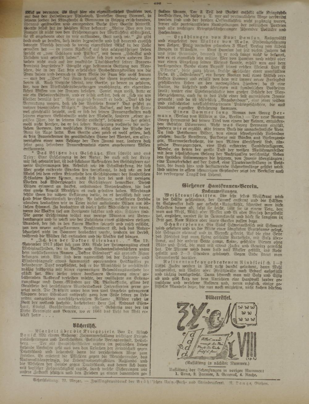 Lluflösung der Scherzfragen in voriger Nummer: 1. Erna, 3. Farmer, 3. General, 4. Rache.