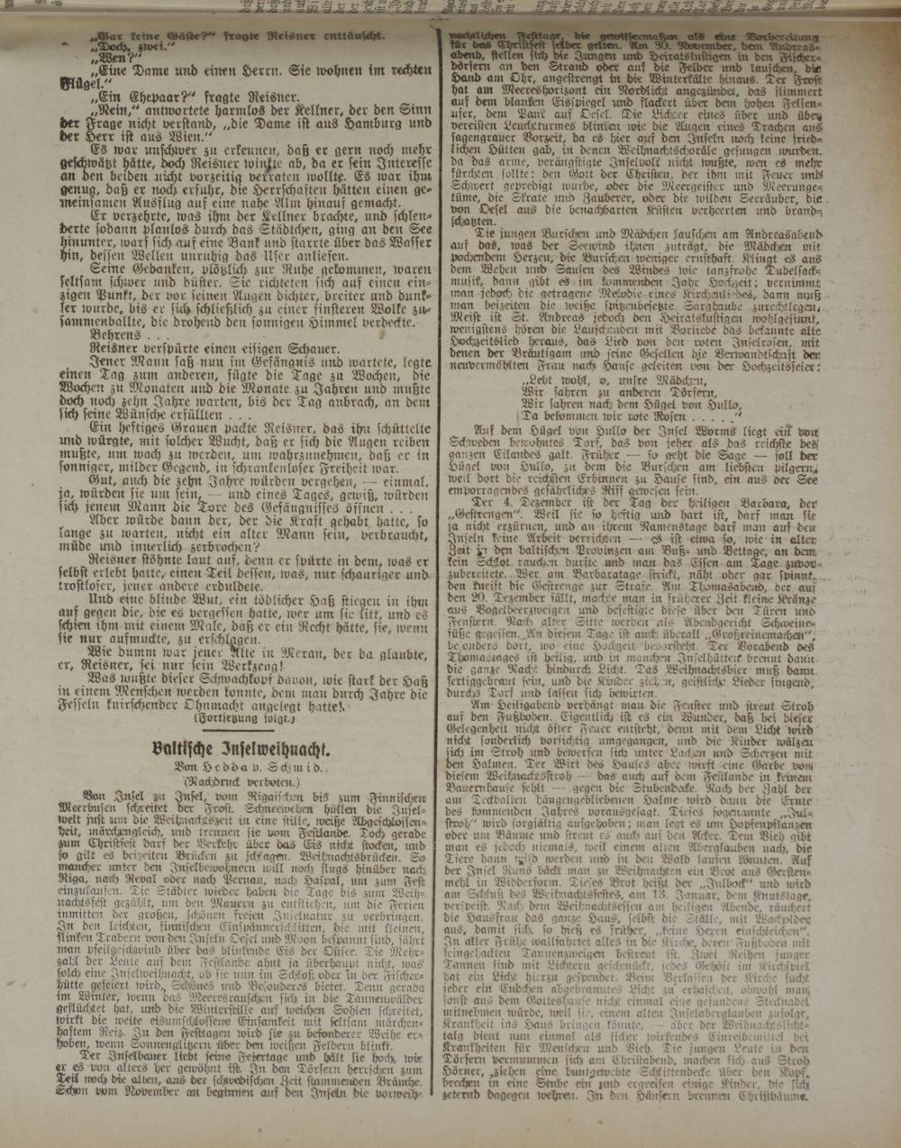 Bort .Insel zu Insel, vom Rigaischm bis zum Finnischen Meerbusen schreitet der Frost. Schneeuncheu hüllen die Inselwelt just um die Mihnackstszeit in eine stille, iveiße Lldgrschlosscn-- hrit, märchmgleich, inib trennen sie uhu Festlande. Doch gerade zum Christfest darf der Berühr über das Ers nickst stocken, tmd so gilt es beizeiten Brückeit zu Magen. Wiilmachksbrückett. So nrancher tmter den Insclbeivohnetm tvill ttock; flugs hinüber nach Riga, nach Reval oder itach Pcrnan, nach Hasval, kiu zum Fest einzuimlfcn. Tie Städter wieder habett die Tage bis zum Weihst a äst s fest gezählt, unr den Mauern zu entfliehen, mit die Ferien inmitten der großen, schjöncn freien .Ju,elnutnr zu verbringen.