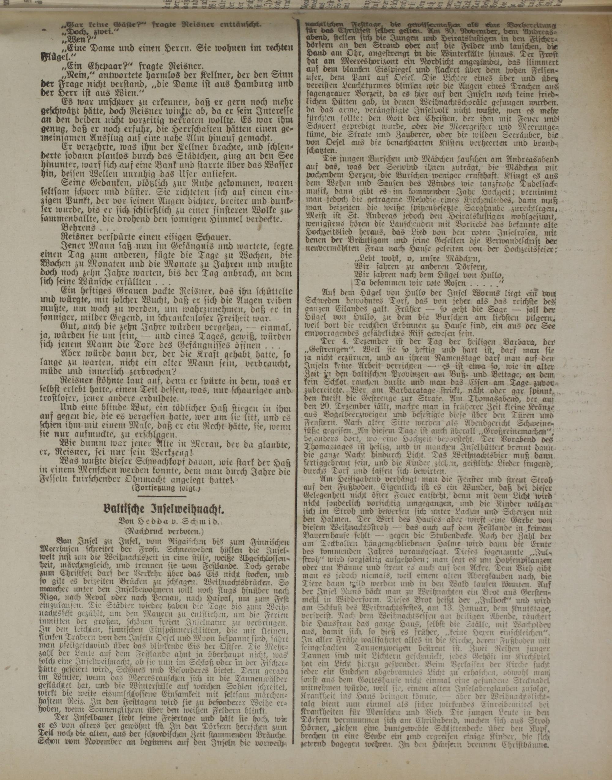 abend, stellen sich die Jungen und Heiratslustigen in den Fischerdörfern atr d«t Strattd oder aus die Felder und lauschen, bir Hand am Ohr, angestrengt tn die Wütterkälte hinaus. Ter Frost hat am Meeres Horizont ein Nordlicht angezündet. das slimniert auf dem blanst.it Eisspiegel und flackert über detn l-ohen Felsenufer, dem Pmti aus Oesel. Die Lichter eines über tmd übet« vereisten Leuch!turmes blintert rvie die ^tttgen eines Drachen an§ sagengrauer Vorzeit, da es hier auf den Inseln noch keine friedlichen Hütten gab, in denen Weihnachtschioräle gesmtgen wurden, da das arme, verängstigte Insel volt nicht tvnßte, wen es mehr fürchten sollte: den Gott der Christen. der ihm mit Feuer und! Schwert gepredigt wurde, oder die Meergeister und Meerunge-; tüme, die Skrate und Zauberer, oder die tvilden Seeräuber, die von Oesel aus die benachbarten Küsten verheerten und branb-, schätzten.