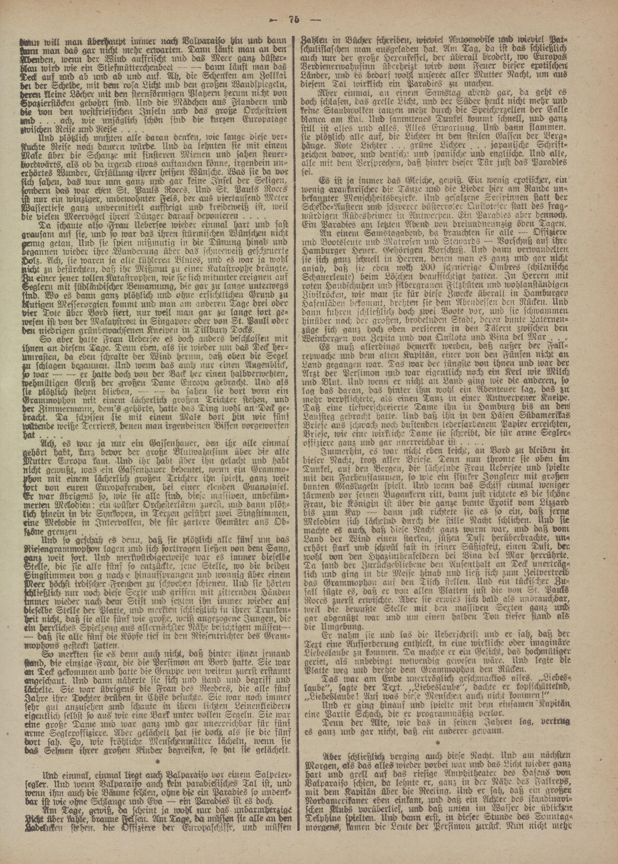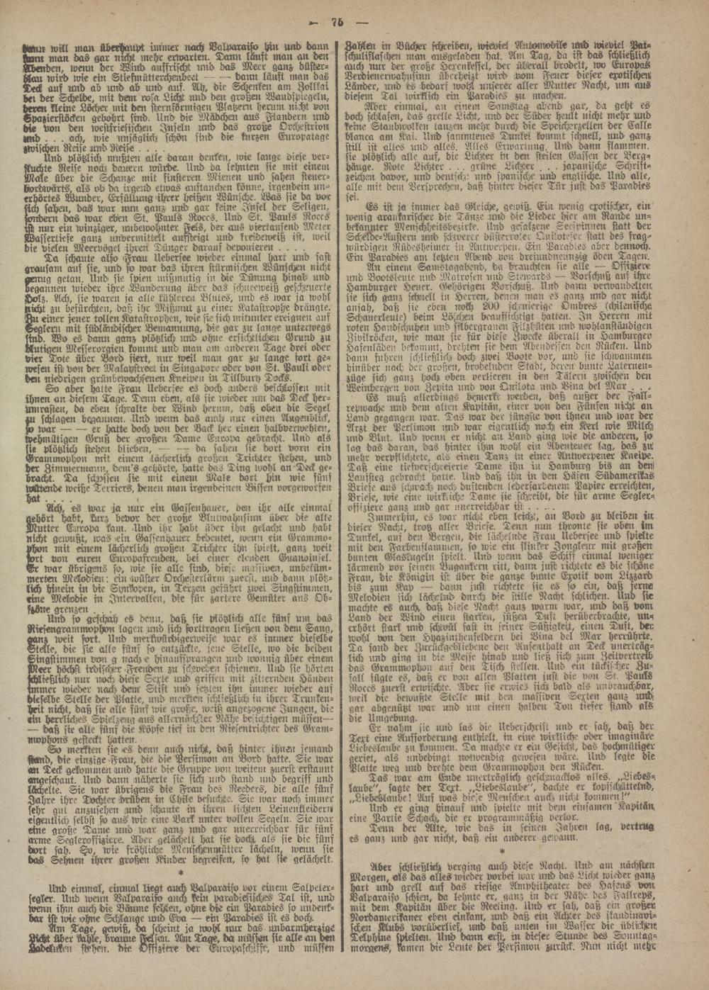 taSut will man überhaupt imnter nach Valparaiso hin mrd dann -vm nmn das gar nrcht mehr erwarten. Tann lauft man an den Menden, ivemr der Wind ansfrischl und- das Meer ganz düster- tzlan wird wie ein Stiefmütterchenbeet — -- dann läuft man das Teck auf rmd ab und ab und auf. AH, die Schenken am_ Zollkai Bet der Schelde, mit dem rosa Licht und den großen Wandsptegeln, deren kleine Löckstr mit dm sternförmigen Platzerir hemm nicht mi Hpazierstöcken gebahrt sind, lind die Mädchen aus Flandern und die van den westfriesisthen Inseln und das große Orchestrion tzmd. . . ach, wie unsäglich schön sind die kurzen Europatage -wischen Reise und Reise ....