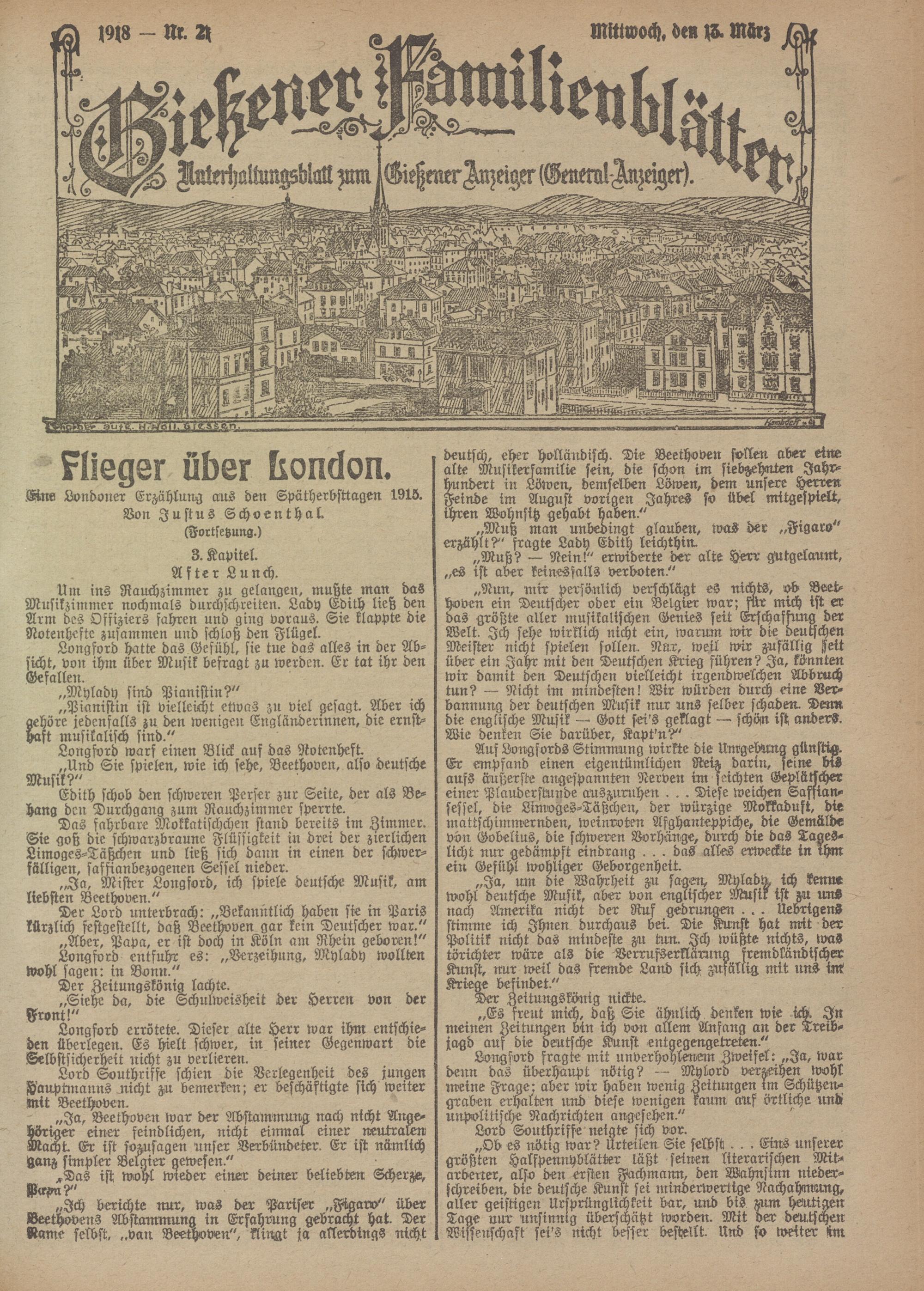 „Ob es nötig war? Urteilen Sie selbst . . . Eins unserer größten Halfpennyblätter läßt seinen literarischen Mit- arbener, also den ersten Fachmann, den Wahnsinn nieder- schreiben, die deutsche Kunst sei minderwertige Nachahmung, aller geisttgerr Ursprünglichkeit bar, und bis zum heutigen Tage nur unsinnig überschätzt worden. Mit der deutschen Wissenschaft sei's nicht besser bestellt. Und so weiter im