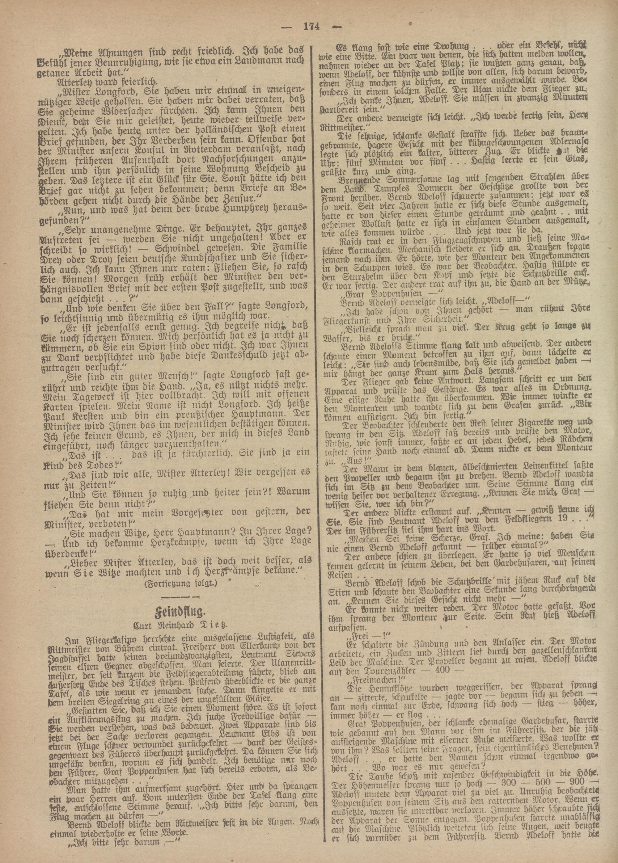 Rasch trat er in den Flugzeugschuppe:: und tteß se:ne Ma- Mine Tarmachen. Mechanisch kleidete er s:ch an. Traußm fragte jemand nach ihm. Er hörte, wie her Monteur den Mgekommmen in den Schuppen rvies. Es war der Beobachter. Hasttg stülpte ex dm Sturzhelm über den D'ps mH setzt- hi- Schutzbrille Er war fertig. Der andere trat auf :hn zu, d:e Hand an der wcutze^ „Graf Poppeuhilsen —", „
