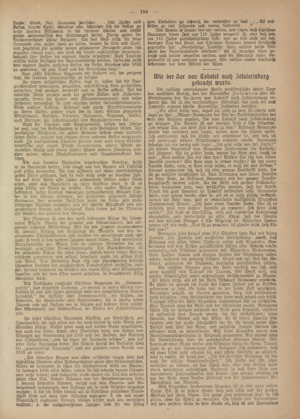 Romanoiv hielt darauf etwa 2Ve Stmrdesr lang Rat mit seiner Familie. .Tie Familie traf wechselnde -Entscheidung: zuerst, daß Nikolaus mit allen seinen Töchtern reisen und Alexandra Fes-, dorowna mit dem Sohne zccrückbleiben solltest irsw. ErMich wurde mitgeleilt, daß Nikolaus zusammen mit Alexandra Feodorowna, ihrer Tochter Maria und einigen Herren. der Begleitung reifen, würde, während die anderen Töchjer, Alexe: :md der Rest des Ge-. folges, zusammen 40 Personen, vorläufig zurückbleibeu sollten^ Am nächsten Morgen ging die Reise wirklich, vor sich, und zwar zunächst von Tobolsk bis Tjnnten, 250 Werst weit, mit gMßer Schnelligkeit unter achtntaligesn Gefährtlvechsel zu Wagen. „Es schien nicht, als ob die Reise Nikolaus Romanow ernrüdets. Er schien in: ganzen im Laufe des letzter: Jahres gut zu Kräften gekommen zu seist. Er hatte viel in der freien Luft gearbettet, Brennholz gehackt, in: Garten gegraben, kurz, sich vollkommen wohl befunden; seine Gesichtsfarbe war denn auch gefuStd tutb frisch. Dagegen schien die Reise Alexandra Feodorowna sehr zu erschöpf«-::. Von Tjumen ging die Reise mit der Eisenbahn weiter. Romastöwj fühlte sich im ribrigen während der Reise ganz behaglich, insofern es wesentlich drei Fragen itmren, die ihn beschäftigten: seine Familie, das Wetter und das Essen. Er ist seiner Familie sehr ergeben und hat große Zärtlichkeit für sie. Er sprach weder über Politik noch über den Krieg, und politische Fragen schienen ihn offenbar nicht zu interessieren. Mle seine Gedanken waren von Familiestastgelegenheites: ist Anspruch geitontmen. Nur einmal ging die Unterhaltung über die gewöhnlich,en -Grenzen hinaus. Wir kamen an einer Kirche vorbei und Nikolaus schlug ein Kreuz. Daraus sagte er zu mir irgendetwas über Religion. Ich antivörtete, daß ich zwar selbst nicht religiös sei, aber jeden: überließe zu glauben, was er 'wollte. Er brach aus: „Ich! bin derselben Meinung, ich bin auch; für völlige Gewissensfreiheit." Ich blickte, auf, ihn, ohne verstehe:: zu können, ob das Spaß war, aber sein Gesicht hatte einen vollständig aufrichtigen Ausdruck, so daß keine Rede von irgendeinem Hintergedanken sein konnte. Im ganzen eutpfing ich aus der Reise einen starken Eindruck von der phänomenalen Beschränktheit des M-annes. .