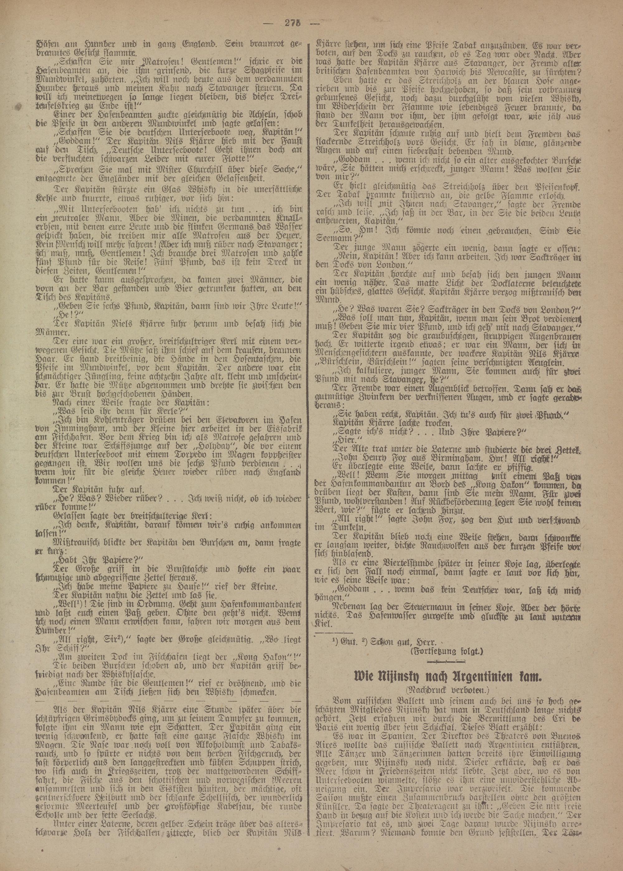 Es war irr Spanien. Ter Direktor des Theaters von Brreuos Aires wollte das russische Ballett nach Argentinien entführen. Alle Tänzer und Tänzerinnen hatten bereits ihre Einwilligung gegeben, nur Nijinsky rroch nicht. Tiefer .erklärte, daß er das Meer schon in Friedenszeiten nicht liebte. Jetzt aber, wo es von Unterseebooten wimmelte, flöße es ihm eine muviderstehliche Abneigung ein. Ter Impresario war verzweifelt. Die kommende Saison mußte einen Zusammeirbru-ch därstelleu ohne den größten Künstler. Ta sagte der Theateragent zu ihm: „Geben Sie mir freie Hand irr bezug ans die Kosten und ich werde die Sache machen." Ter Impresario tat es, und zwei Tage daraus wurde Nijinsky arretiert. .Warum? Niemand konnte den Grund sesistellen. Ter Tau-