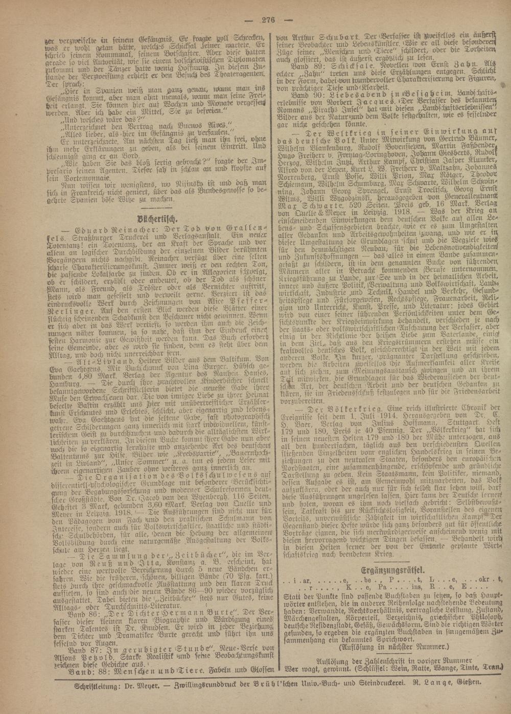 <0 Baer Verlag von Julius Hoffmann, Stuttgart. Heft 179 und 180, Preis.je 40 Pfennig. Ter „Völkerkrieg" hat sich in seinen neuesten Heften 179 und 180 der Mühe unterzogen, aus all den hundertfachen, täglich aus den verschiedensten Quelleii sließendeu Einzelheiten vom englichen Handelskrieg in seinen, Beziehungen zu den neutralen Staaten, besonders den europäischeu. Nordstaaten, eine ziusammerchängeüde, erschöpfende und gründliche Tarstellung zu geben. Kein Staatsmann, kein Politiker, niemand, dessen Aufgabe es ist, am Gemeinwohl mitzuarbeiten, das Volk anfzuklären, oder der auch nur für sich selbst klar sehen will, darf diese Ausführungen ungelesen lassen. Hier kann der Deutsche lernen' und holen, woran es ihm noch vielfach gebricht: Selbstbew-usst- sein, Tatkraft bis zur Rücksichtslosigkeit, Voranstellen des eigenen! Vorteils, uuverwüstliche Zähigkeit im wirtschaftlichen KampQ Ter Gegenstand dieser Hefte würde sich ganz besonders gut für öffentliche Vorträge eignen, die sich merkwürdigeriveise anscheinerld ivenig mit diesen hervorragend wichjtigen Dingen befassen. — Behandelt wich in diesen Heften ferner der von der Entente geplante Wirt-i schaftskrieg nach beendetem Krieg.