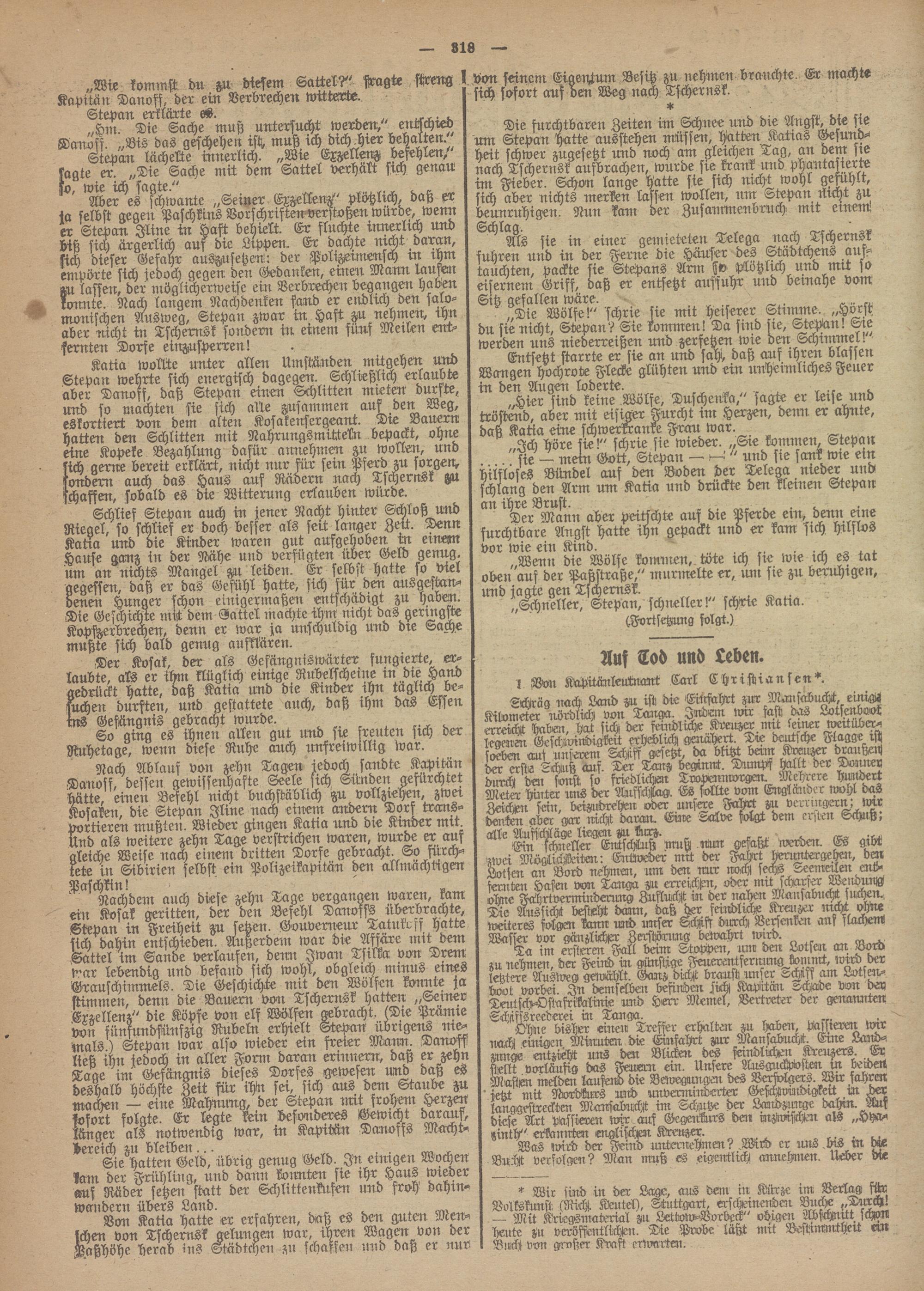 Katia wollte unter allen Urnständen mitgehen und Stepan wehrte sich energisch dagegen. Schließlich erlaubte aber Danosf, daß Stepan einen Schlitten mieten durste, und so machten sie sich alle zusammen auf den Weg, eskortiert von dem alten Kosakensergeant. Die Bauern hatten den Schlitten mit Nahrungsmitteln bepackt, ohne eine Kopeke Bezahlung dafür armehmen zu wollen, und ' ich gerne bereit erklärt, nicht nur für sein Pferd zu sorgen,