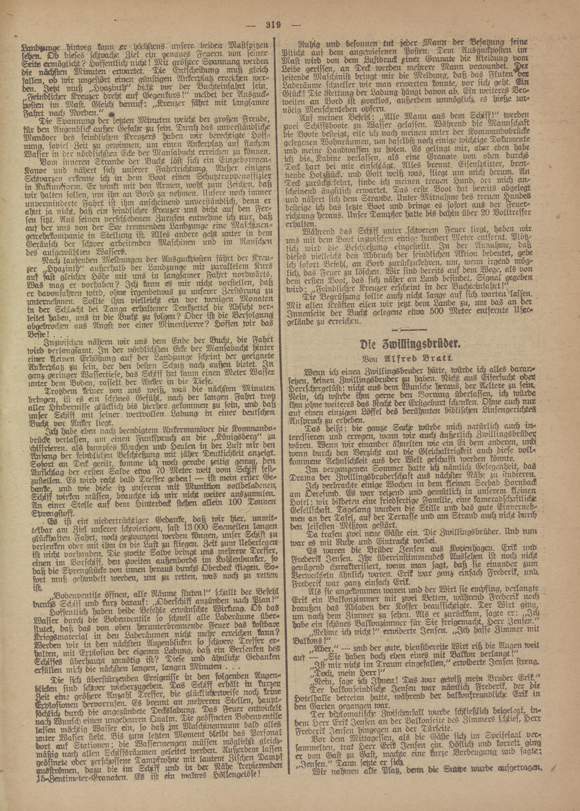 Landzunge hinweg -tarn sx höchsMs unsere decken MMpitzen scheu. Ob dieses Wvache Ziel ein geriäues Feuern von seiner Seide ermöglicht? Hoffentlich nicht! Mtt größter. Spannmig werden die nächslim Minuten erwartet. Die Entschecknng muß gleich fallen, ob wir ungestört einen Einstigen WSeMatz erreichen werben. Jetzt muß „Htiazinth" dicht vor der BuchtemfaA fern. .Feindlicher Kreuzer dreht auf Gegmkurs! nwldet der Ausgucke jwsien im Mast. Glech daraufst „Kreuzer fährt mit langsamer