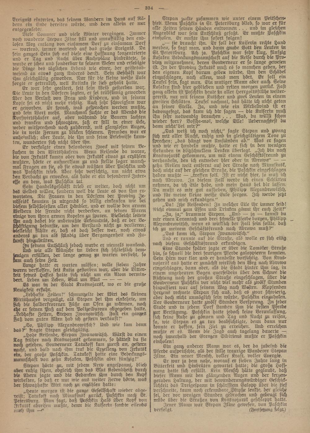 zehn Meilen tveit entfernt auf der Straße nach Minusinsk, doch nicht aus der gleichen Straße, die Paschkin eingeschlagen haben mußte — „treffen soll. Ist er nicht hier, so muß ich nach Wrowa. In diesem Fall werde ich einen Schlitten nehmen, da ich Eile habe, und mein Haus bei dir lassem Du mußt es mir gut ausheben, Philipp Alexandrowitsch, und für meine kleine weiße Eule sorgen. Ich werde jetzt gehen und mich erkundigen."