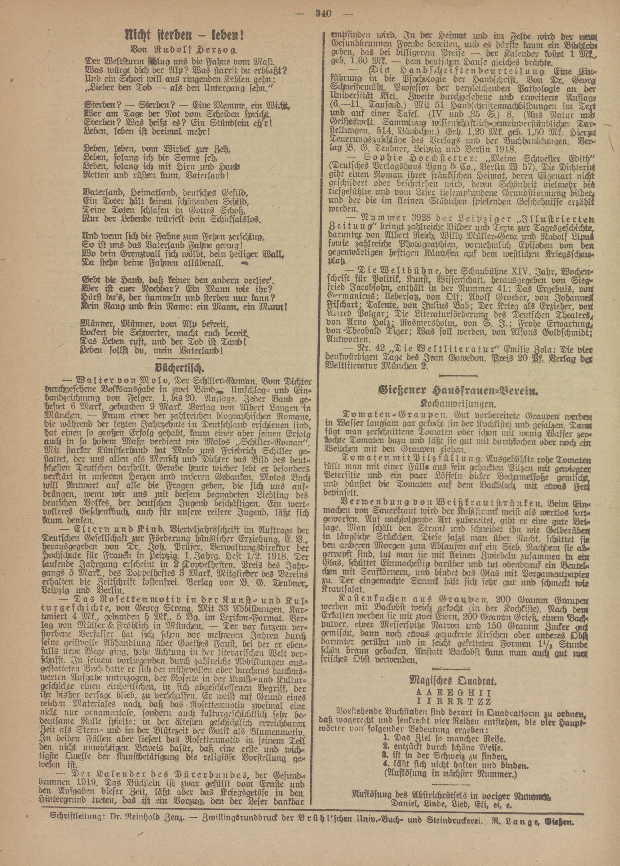 Schriftleitung: Dr. Reinhold Zenz. — Zwillingsrunddruck der Brühl'schen Univ.-Buch- und Steindruckerei. R. Lange, «ietzen.