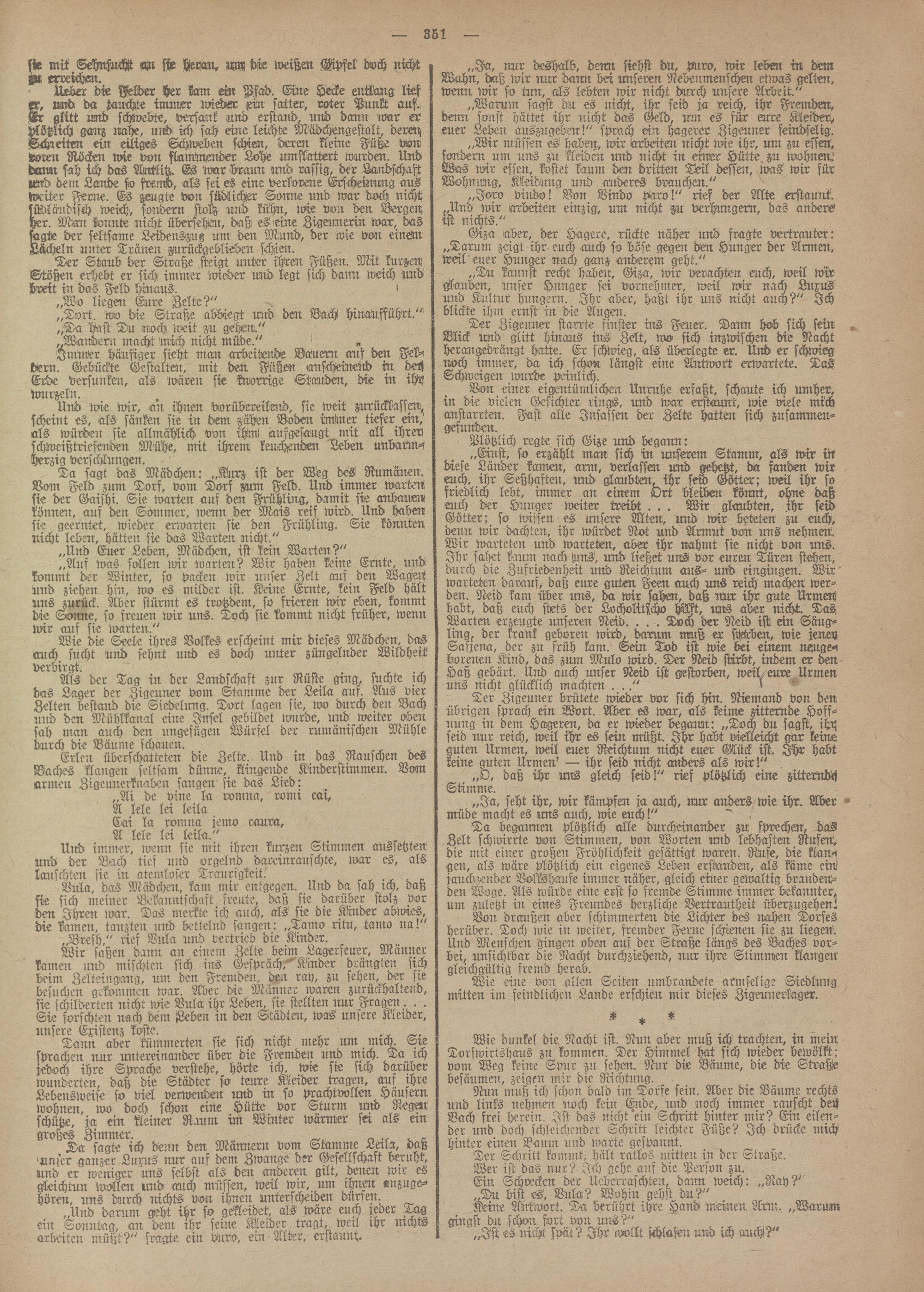 Urüer die FeLer her kam ein Wad. Eine Hecke entlang lief vnd da tauchte immer tviÄ«r xrn satter, roter Punkt ans. glitt und schwebte, versank und erstand, und dann ivar er plötzlich gmrz nahe, urrd ich sah eine leichte MLdchengestalt, dererz Schreiten ein eiliges Schweben schien, deren kleine Füße von doren Röcken wie von flancknender Lohe umflattert wurden. Und dwur sah ich das Antlitz. Es war draun und rassig, der Landschaft und dem Lande so fremd, als sei es eine verlorene Erscheinung aus weiter Ferne. Es zeugte von südlicher Sonne und war doch nicht südländisch weich-, sondern ftol? und kühn, wie von den Bergen her. Mail konnte nicht übersehen, daß es -eine Zigeunerin ivar, das ftlgte der seltsame Leidens-zug um den Mund, der wie von einem Lächeln unter Tränen zurückgeblieben schien.