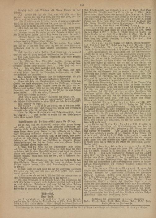 — Ein neuer Theater-Mlmanach ist unter bet) Aegide von Generalintendant Geheintrat Zeiß von Müller-Wal-- deNbnrg redigiert als „Frankfurter Almatmch der städtischen Bühnen" erschienen. (Verlag Max Kvebcke, Franffurt a. M., Mk. 4,50.) Mitarbeiter von Ruf — Geheimrat Zeiß, Prof. Schreker, Dr. Gebrecht, Pros. Christiansetr, Dr.,W. Mießner, Hugo Schlemüller, Schulte v. Brühl, Kgl. Regisseur Legal u. a. — haben mit ihrer Erörterung allgemeiner Kunst- und Theaterftagen^ mit reizvollen Lokalbeiträgen mtd besten Feuilletons den Alma- nach zu einem gewissenhaften Berater für Künstler mtd Publikum gemacht. Eine Preisfrage „Welche Rücksichtnahme schulde ich als Theaterbesucher dem Kunstwerk, den Künstlern und den übrigen Zuhörern?" wird rege Beteiligung finden.