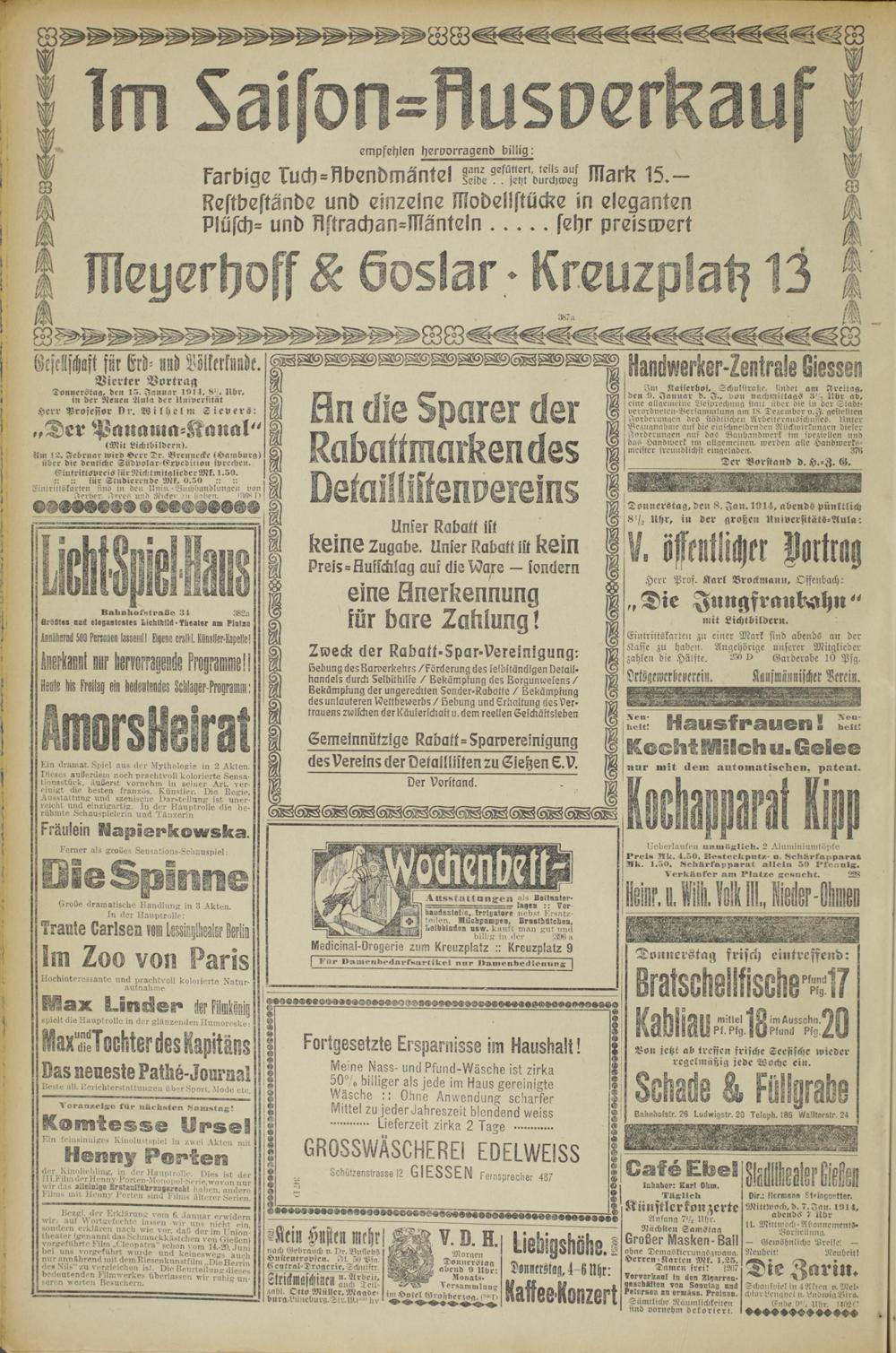 Bezgl der Erklärung vom (5. Januar erwidern Wir: aut Wortgefechte lassen wir uns nicht ein, sondern erkoren nach wie vor, daß der im Union- theater (genannt das Schmuckkästchen von Gießen) vorgefuhrtc 1-ilin ,.Cleopatra" schon vom 14.-20. Jun bei uns vorgeführt wurde und keineswegs auch nur annährend mit dem Riesenkunstfilm ..Die Herrin des Nils" zu vergleichen ist Die Beurteilung dieses bedeutenden Filmwerkes überlassen wir ruhig unseren werten Besuchern.