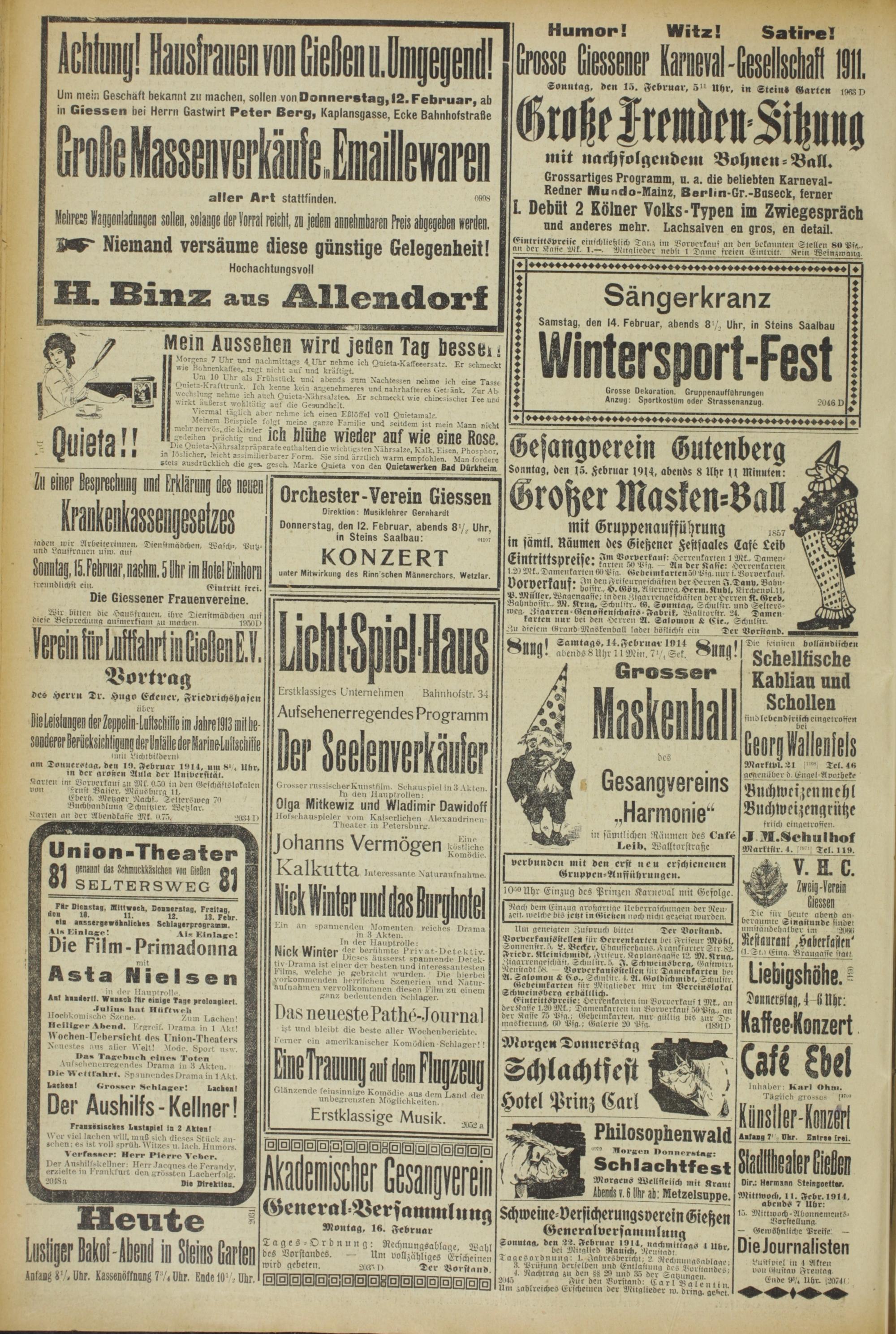 Um mein Geschäft bekannt zu machen, sollen von Donnerstag, 12. Februar, ab in Giessen bei Herrn Gastwirt Peter Berg, Kaplansgasse, Ecke Bahnhofstrafle