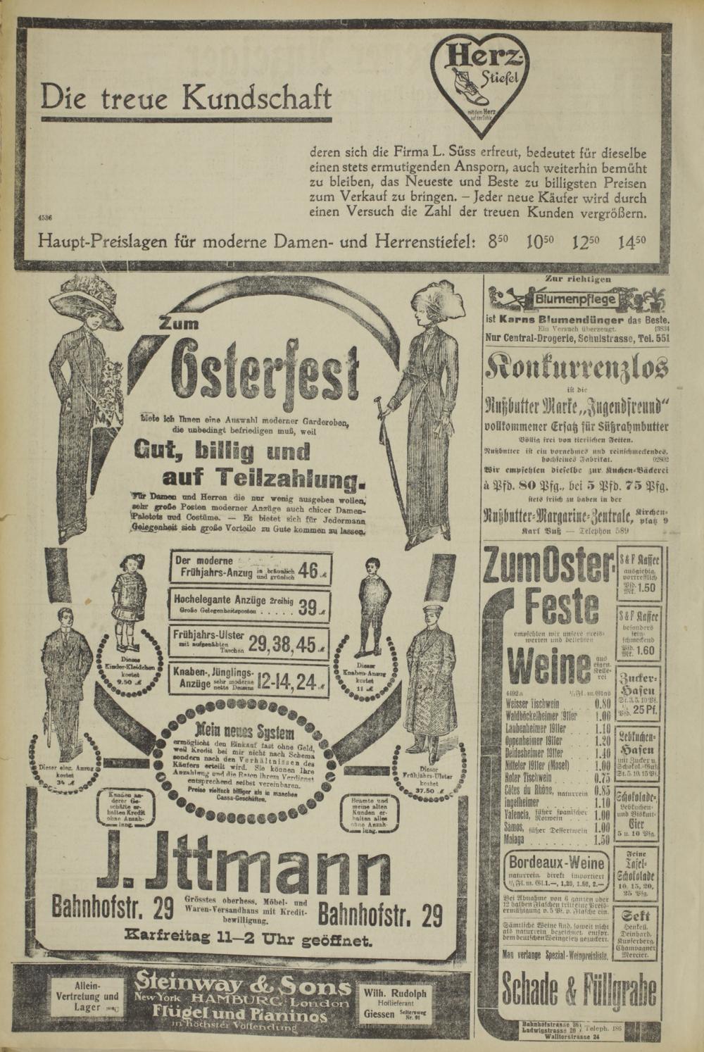 deren sich die Firma L. Süss erfreut, bedeutet für dieselbe einen stets ermutigenden Ansporn, auch weiterhin bemüht zu bleiben, das Neueste und Beste zu billigsten Preisen zum Verkauf zu bringen. - Jeder neue Käufer wird durch einen Versuch die Zahl der treuen Kunden vergrößern.