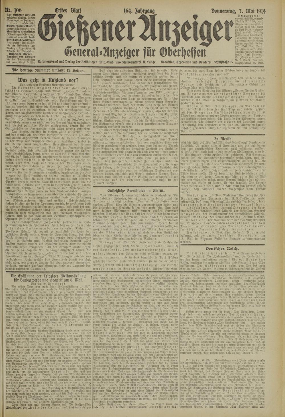 monatlich?» Bi., vierteljährlich Mk. 2.20: durch Abhole- u. Zweigstellen monatlich 65 Bf.: durch die Bost Mk. 2.— viertel- jährl. ausschl. Bestell-, Zeilenpreis: lokal 15Pf^ auswärts 20 Bieuuiq. Chefredakteur: 2l Goetz. Verantwortlich für den polit. Teil: Aug. Goerz; für ,Fe»nlleton", »Vermischtes ^ und»Derichts- faal": ^arl Sleurath; für »Stadt und Land":