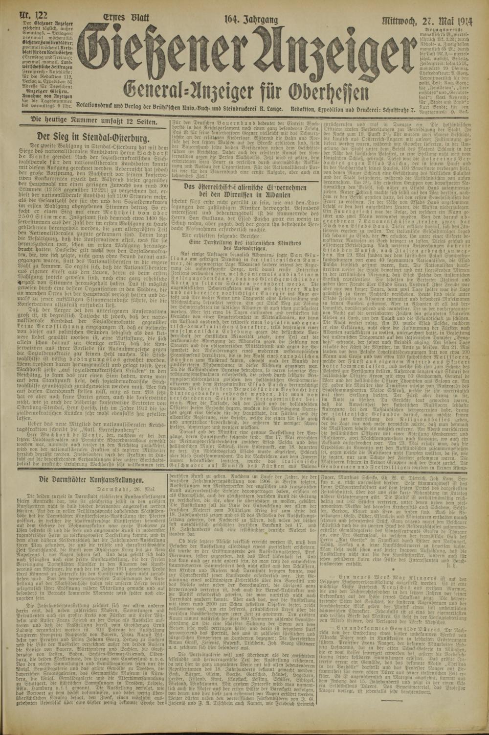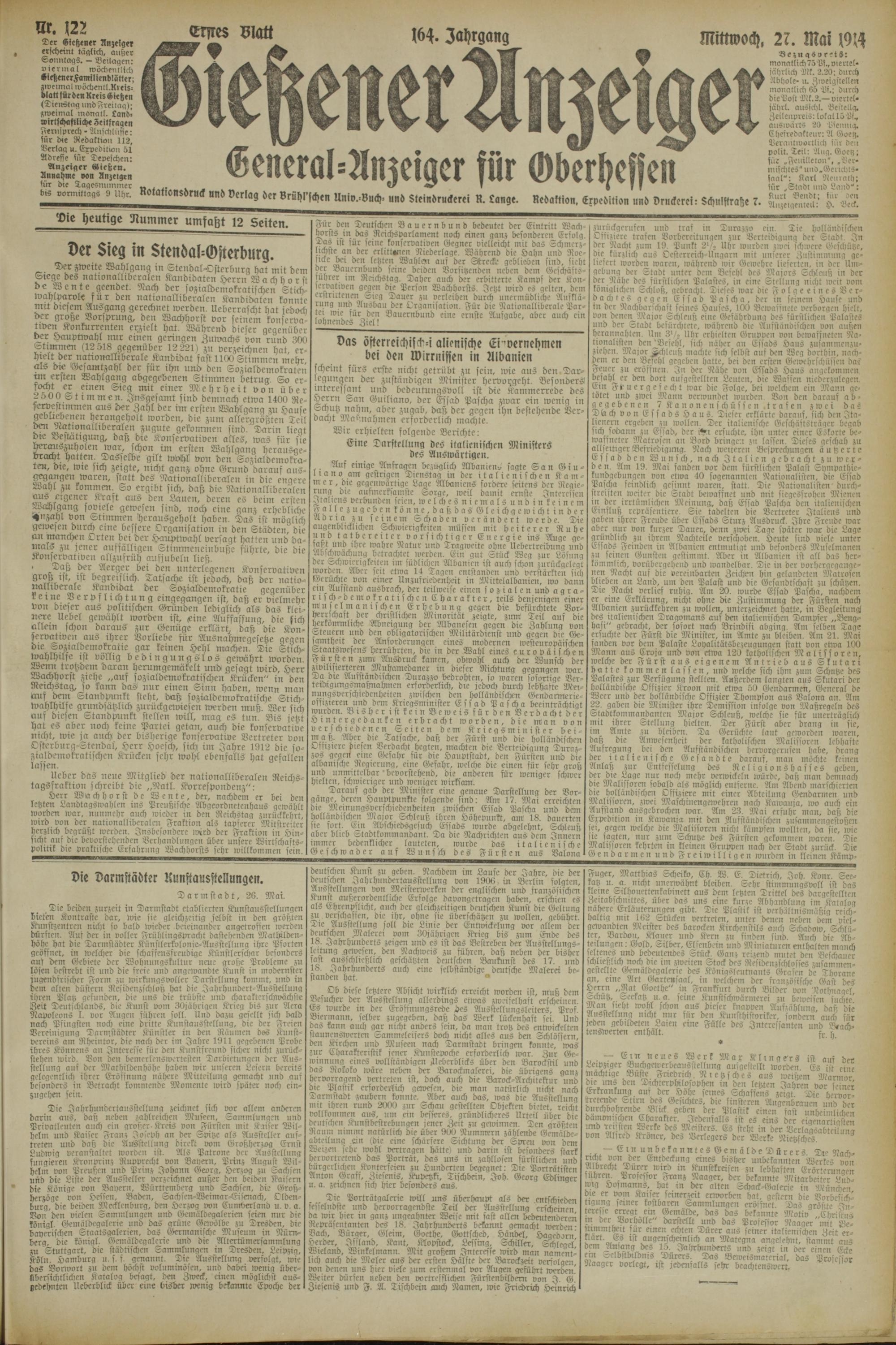 Fernlprech - Aujchlnstc: für d<e RedakNon 112, Verlag u, Expedition öl Adresse lnr Depeschen: Anzeiger Kießen. Annahme »an Anzeigen für die Tagesnnmmec bis vormittags S Uhr.