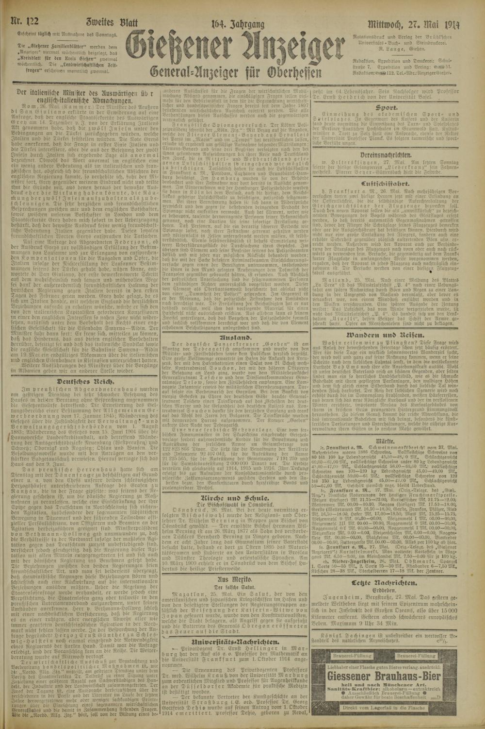 — Privatdozent Tr. Ernst Hellinger in Marburg hat den Ruf als a. o. Professor der Mathematik an die Universität Frankfurt zum 1. Oktober 1914 angenommen,