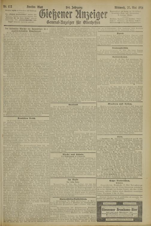 J'ugenheim, Bergstraße, 27. Mai. Das gestern gemeldete Weltbeben liegt mit seinem Epizentrum wahrscheinlich in der Inselwelt des Großen Ozeans, also über 15 000 Kilometer entfernt. Gestern abend schwächeres europäisches Beben. Maximum 0 Uhr 34 Min.