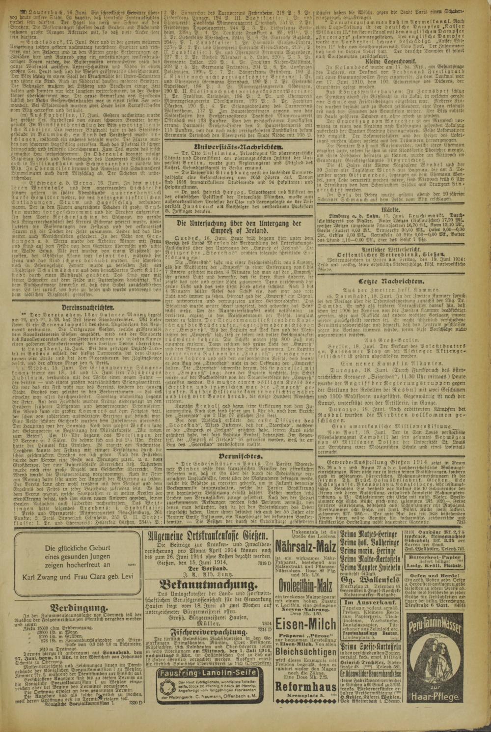 Die Beiträge zur Kranken- und Invalidenversicherung pro Monat April 1914 können noch bis zum 26. Juni 1914 ohne Kosten bezahlt werden, Gießen, den 15. Juni 1914. 73190
