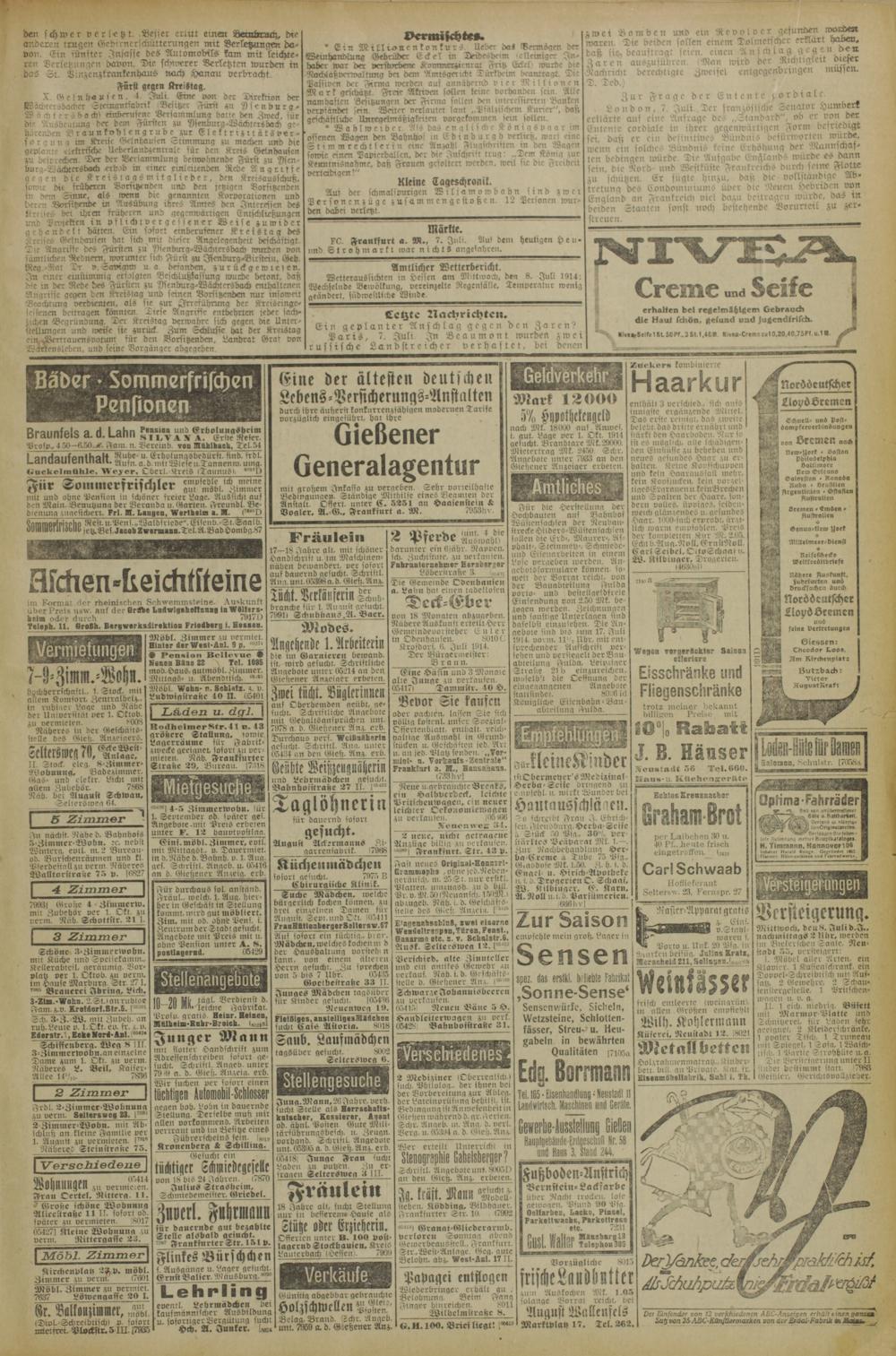 Wetteraussichten in Hessen am Mittwoch, den 8. Juli 1914: Wechselnde Bewölkung, vereinzelte Regrnsälle, Temperatur wenig geändert. südweliliche Winde.