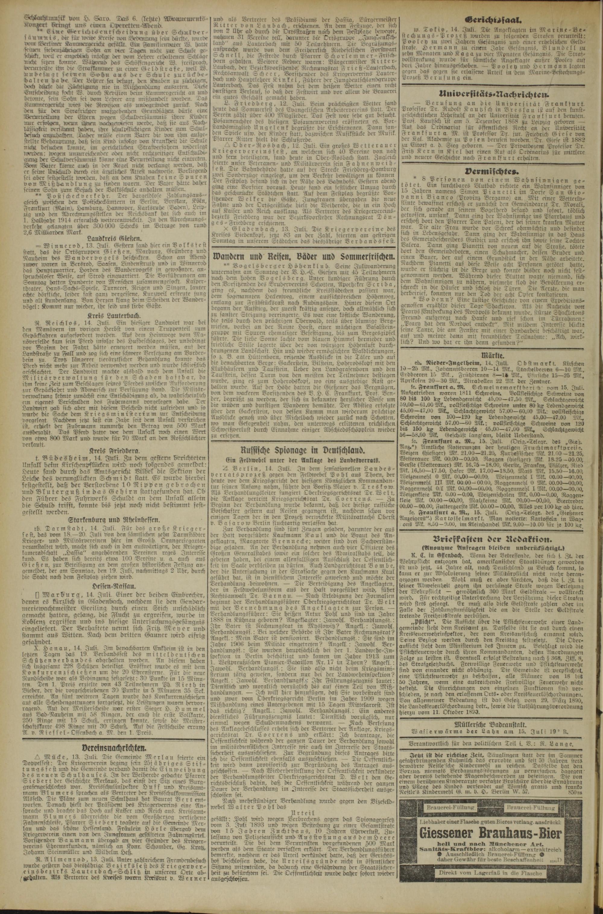 fc. Frankfurt a. M., 15. Juli. (Orig.-Telegr. des .Gießener Anzeigers") Kartoffelmarkt. Man notierte: Kartoffeln in Wagons Mk. 8.50-9.00, im Kleinhandel Mk. 9.00—10.00 st'ir se 100 h»