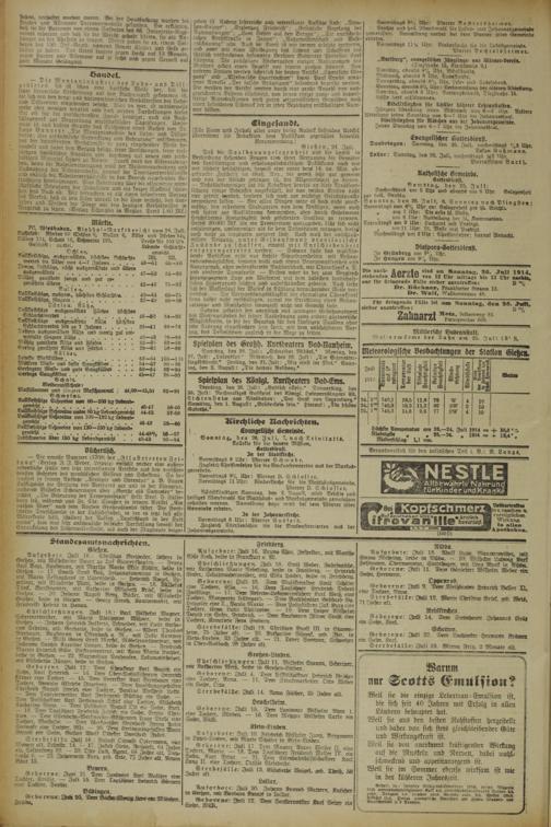Geborene: Juli 17, Dem Maurer Anton Weller II. eine Tochter, Maria, — 18, Dem Taglöhner Friedrich Weller IV, ein sohn, Kurt Artur, — 21. Dem Etienbahnhilssschaffner Karl Lang II, eine Tochter, Ottilie Elesabcthc,