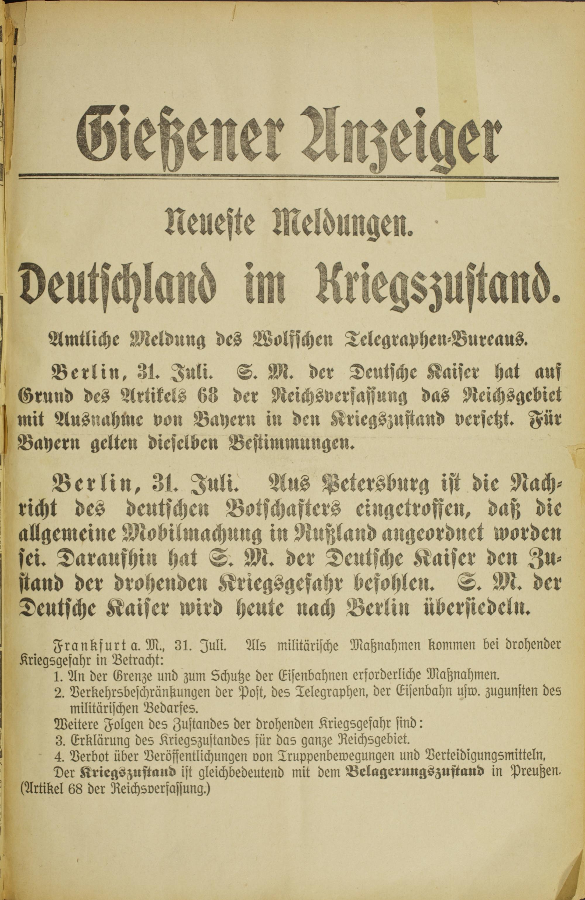 , Berlin, 31. Juli. S. M. der Deutsche Kaiser hat aus Grund des Artikels 68 der Neichsdersaffung das Reichsgebiet ! mit Ausnahme von Bayern in den Kriegszustand versetzt. Für Bayern gelten dieselben Bestimmungen.