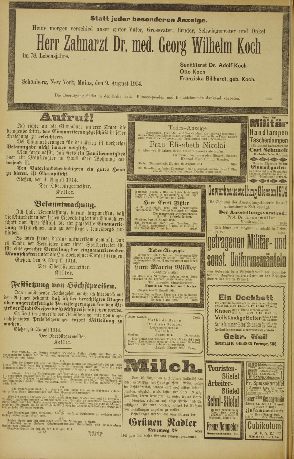 Im Namen der trauernden Hinterbliebenen: Konrad Nicolai und Kinder. Gießen (Dammstraße 25), den 10. August 1914. 9134
