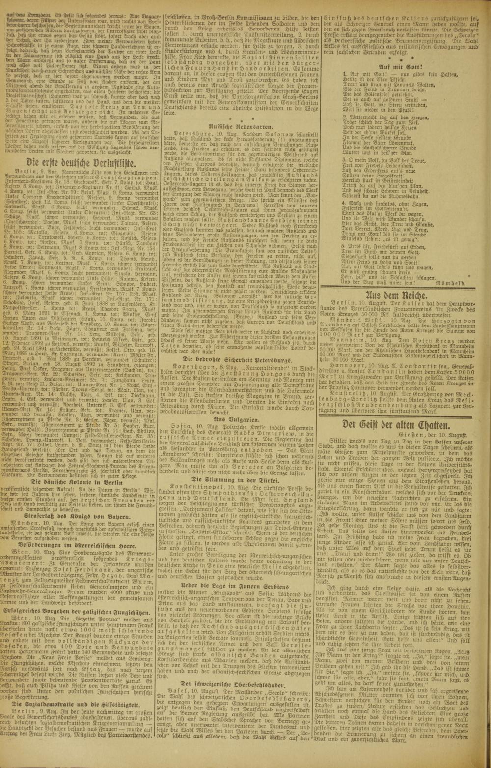 Berlin, 9, Ang. Namentliche Liste von den Gesallenen und Berwimdeten aus den Gefechten unserer G renzschutztruppen: Jnsanterie-Regimenl Nr, 18: Grabvivski. Gcfr, 7, Komp, tot: (baut, Reserv, 8, Komp, wt: Jnsanterie-Regimcnt Nr, 41: Gailus, Musk, 4. Komp, tot: Jnf,-Neg, Nr, 59: Brink. Musk, 9, Komp, verwundet -linker Oberarm Knochensplitters: Nielsen, 9, Komp, verwundet (Schulder): Haß 12. Komp, leich: verwundet (linker^ Oberschenkel): Salewski, Musk, 6, Komp, leicht verwundet; Schnack, Musk, 6, Komp, leicht verwundet «linker Oberarm): Jnf-Regt. Nr, 63: Schütze, Musl, schwer verwundet: Geppert. Musk, verwurrdet >Quetschn»nrdc>: Daehne, Ddusk, leicht verwundet: Talmar, Reserv, leicht vernmudet: Buhr, Feldwebel leicht vernmndet: Jnf-Regt, Nr, lob: Matalla, Reserv, 6, Komp, tot: Glogvwisc, Reserv, 6, Komp, tut; Tyrakowski, Reserv, 6, Komp, to:: Köstlich. Reserv. 6, Komp, wt: Rother, Musk, 7, Komp, tot: Hänsch, Tambour 8, Komp, tot: Seitmann, Musk, 8, Komp, tot: Inf, Regt, Nr, 156: Parwel, Gesr, 6, Kömv, tot:'Cech, Cnprian, Reserv, 6, Komp, tot: Schubert, Ignatz, Gesr, d, R, 6, Komp, tot: Thoms, Reinh,, Musk, 7, Komp, tot: Kattner, Musk, 7, Komp, schivec verwundet (beide Arme : Sonntvald, Musk. 7, Komp, verwunde!: Krasiezyk, Alexander, Musk, 6. Komp, leicht verwundet: Szvsla, Hermann, Reserv, 6, Kvcnp, schwer verwundet «linke Huste): Rajawa, Reserv, 6, Kvmp, schwer verwundet (linkes Bein«: Schoove, Hubert, Unterofs, 7, Komp, schwer verwundet: Kreikenbolm, Musk, 7, Kvmp, schwer verwundet ("treibe Arme): Ins,-Regt, Rr, 157: Kost, Musk, tot: Zielontla, Musk, schwer verwundet: Jnf.-Regt, Nr, 17l: Schobuig, Josef, Reserv, geb, 8, Juni 1888 in Kaysersberg, Kr, Rappoltsweiler, 1, Komp tot: Kropf, Theodor Franz, Musk, geb, 6, März 1891 in Eisenach. 1, Komp, tot: Winkler. Emil Lnciau Anwn aus Mülhausen (Elsaß), 10. Komp, tot: Jacobi, Gustav Adolt, aus Beckerseld bei Arnsberg, 10, Komv, tot: Jäger- bataillon Nr, 14: Hecht, Jäger. Chauffeur mts Freiburg, verwundet: Dragoner-Regt, Nr. 14: Lenz. Wilhelm, Gesr., geb, 15. 'August 1891 in Meiningen, wi: Heinrich Alfred. Gesr,, geb. 12, Februar 1892 zu Koitbus. vermißt: Kunkel, Wilhelm, Unterofs,, geb, 24, April 1891 zu Lieberstädt, vermißt: Kollek, Otto, geb, 16, März 1889 zu Horst. Kr, Hattingen, verwundet (Arm): Möller Fr,, Unterost,, geb, 1. Mai 1881, zu Parchim, verwundet (Schulter): Singer, Lucian, geb, 18, August 1892 zu Sennheim, gefangen: Heinz, Paul Oskar, Dragoner aus Untermarxgrör (Sachsen), wt: Dragoner-Regt. Nr, 22: Schneider, Gesr, tot: Reichmann, Dragoner, vermißt: Husaren-Regiment Nr. 7: Junghann, Leutn, d, R, tot: Reich II,. Husar, wt: Ulanen-Regt, Nr, 1: Noack, Einj- Freiw.-Unteroft, wl: Farster. Tromv.-Sergt, tot: Malt, Ulan, wt: Ulanen-Regt, Nr, 14: Busche, Ulan, 4, Esk, wt: Dieckmann, Lentti, 4. Esk. verwundet und vermißt: Hauser, Ulan, 3, Esk, verwundet nich vermißt: Aderhvlz, Unterofs, 3, Esk, verwundet: Ulanen-Regt, Nr, 15: Krüger, Eefr, tot; Kramer, Ulan, verwundet und vermißt: Schäfer, Ulan, verwundet und vermißt: Jägerregiment zu Pferde Nr, 3: Geil.w, Jäger, vermißt; Asal, Gesr,, vermißt: Jägerregiment zu Pse.de Nr, 5: Baader, Kurt, verwundet (Hals): Jägerregiment zu Pferde Nr, 11: Bach, Philipv, Gesr., schwer verwundet (Lunge): Feld-Artillerie-Regt, Nr. 35: Schalow, Tromv,-Unterofs, 1, Batt, verwundet; Feld-Artillerie- Regt, Nr, 57: Hilbek, Leutn, d, R, Sturz mit dem Pferde (beide Handgelenke verletzt). Der Ort und das Datum, an dem die ernzelnrn Gefechte statkgesunden haben, können bis auf weiteres iricht veröffentlicht werden, doch gibt den sich ausweifenden Angehörigen aus Anfragen das Zentral-Nachweis-Bureau des Krieqs- Ministeriums Berlin, Dorotheensrraße 48. schriftlich oder mündlich Auskunft, Die Bertoundeten befinden sich in guter Pflege,