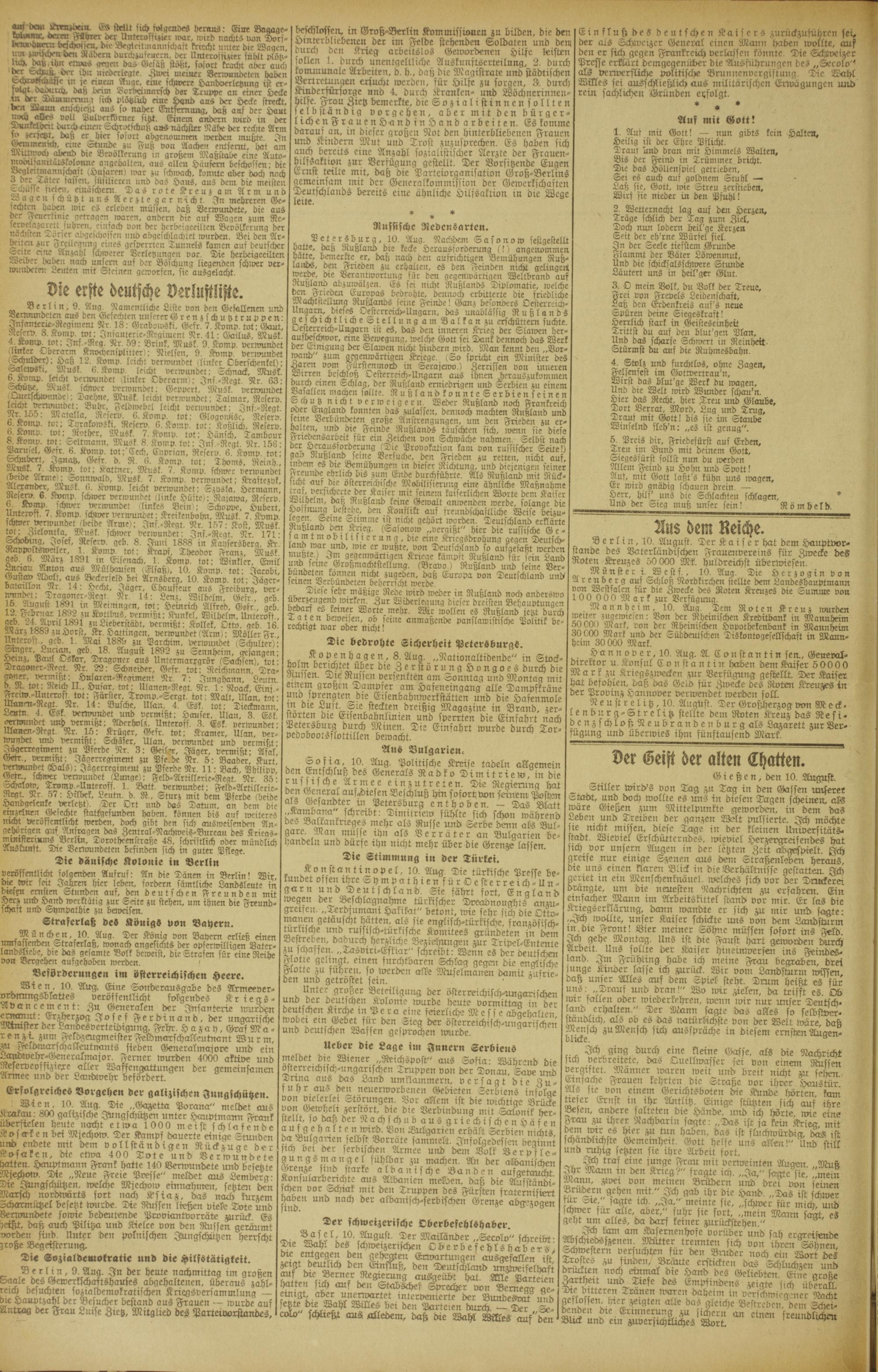 Diese sehr mäßige Repe wird weder in Rußland noch anderswo überzeugend wirken. Zur Widerlegung dieser dreisten Behauptungen bedarf es keiner Worte mehr. Wir wollen es Rußland jetzt durch Taten beweisen, ob seine anmaßende panslawisttfche Politik berechtigt war oder nicht!