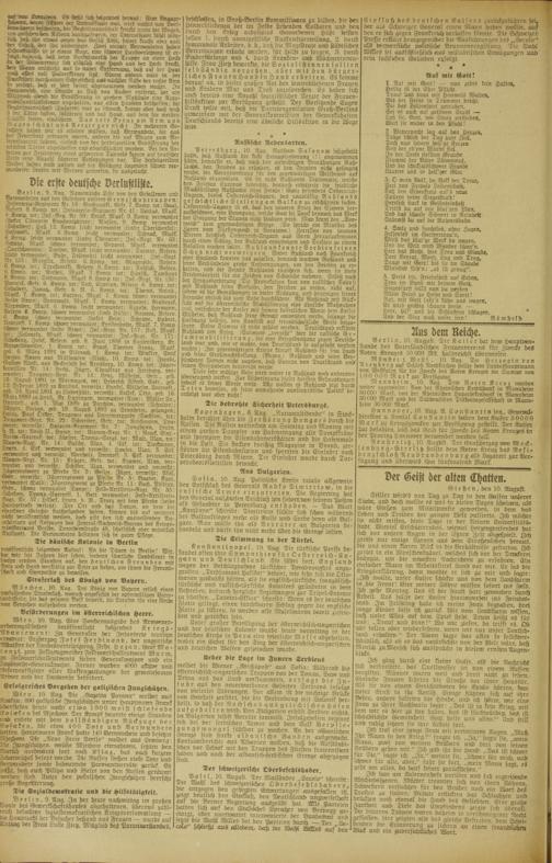 Berlin, 9 Aug, In der heute nachmittag im großen Saale des Gewerlschaftshauses abgehaltenen, überaus zahlreich besuchten sozialdemokratischen Kriegsversammlung — bk Hauptzahl der Besucher bestand aus Frauen — wurde auf Antrag der Frau Luise Zietz, Mitglied des Parlcutorstandes,