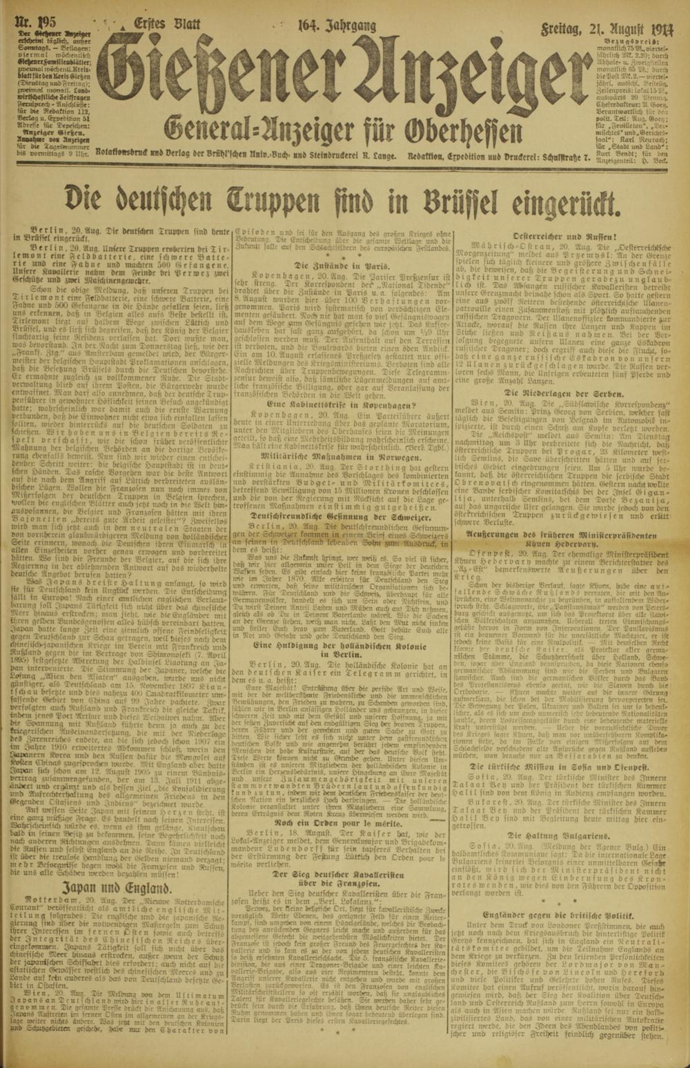 Berlin. 20. Aug. Die deuticken Truppen sind heule in Brüssel eingrrückl.