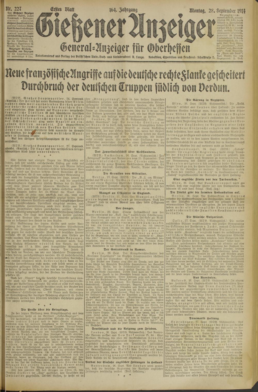 (282:33., Grobes Hauptquartier, 26. Zrptemb. «Amtlich.) Der Fe i nd hat unter Ausnutzung seiner Eisenbahnen einen weit ausholcndcn Vorstotz gegen die äutzerste rechte Flanke des deutschen Serres eingcleitet. Eine hierbei auf B a p a u m e vorgetzende französische Division ist von schwächeren deutschen Kräften zurückgrwotfcn, auch sonst ist der Vorst o tz z u m S t e h c n g e b r a ch t w o r d e n. In der M i t t c der Schlecht front ging unser Angriff an einzelnen Stellen vorwärts. Die angegriffenen Sperrforts südlich von Verdun stellten ihr Feuer ein. UnsereMrtillcrie steht nunmehr im Kampfe mit Kräften, die deMeind auf dem westlichen Maasufer in Stellung brachte.