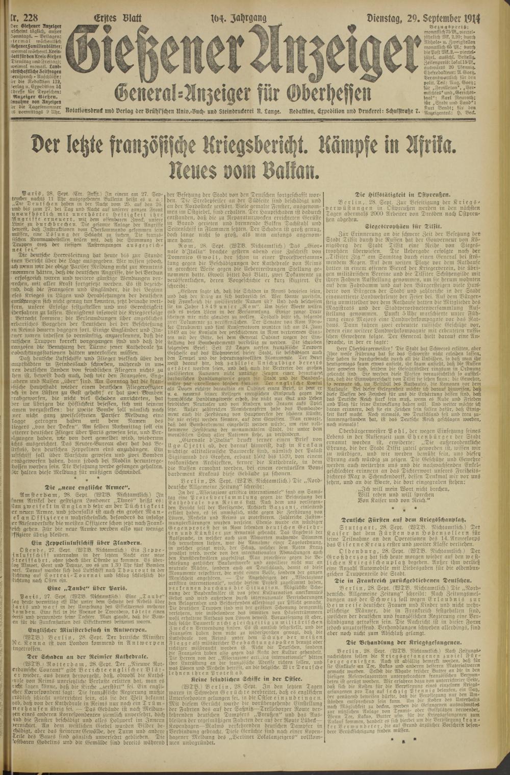 rschcint täglich, außer Sonntags. — Beilagen: nermal wöchentlich iiebener^amiliendlätter; wcimal wöchentl.iireir- latlfürdenirreirAiehen Dienstag und Freitag): weimal monatl. Land- -irtschastlichr Seitfragea lernsprech - Anschlüsse: är die Redaktion 112, ierlag ». Expedition öl l breite tür Depeschen: Anzeiger Gießen. Annahme von Anzeige» Ir die Taqesnninmer is vormittags 3 Uhr.