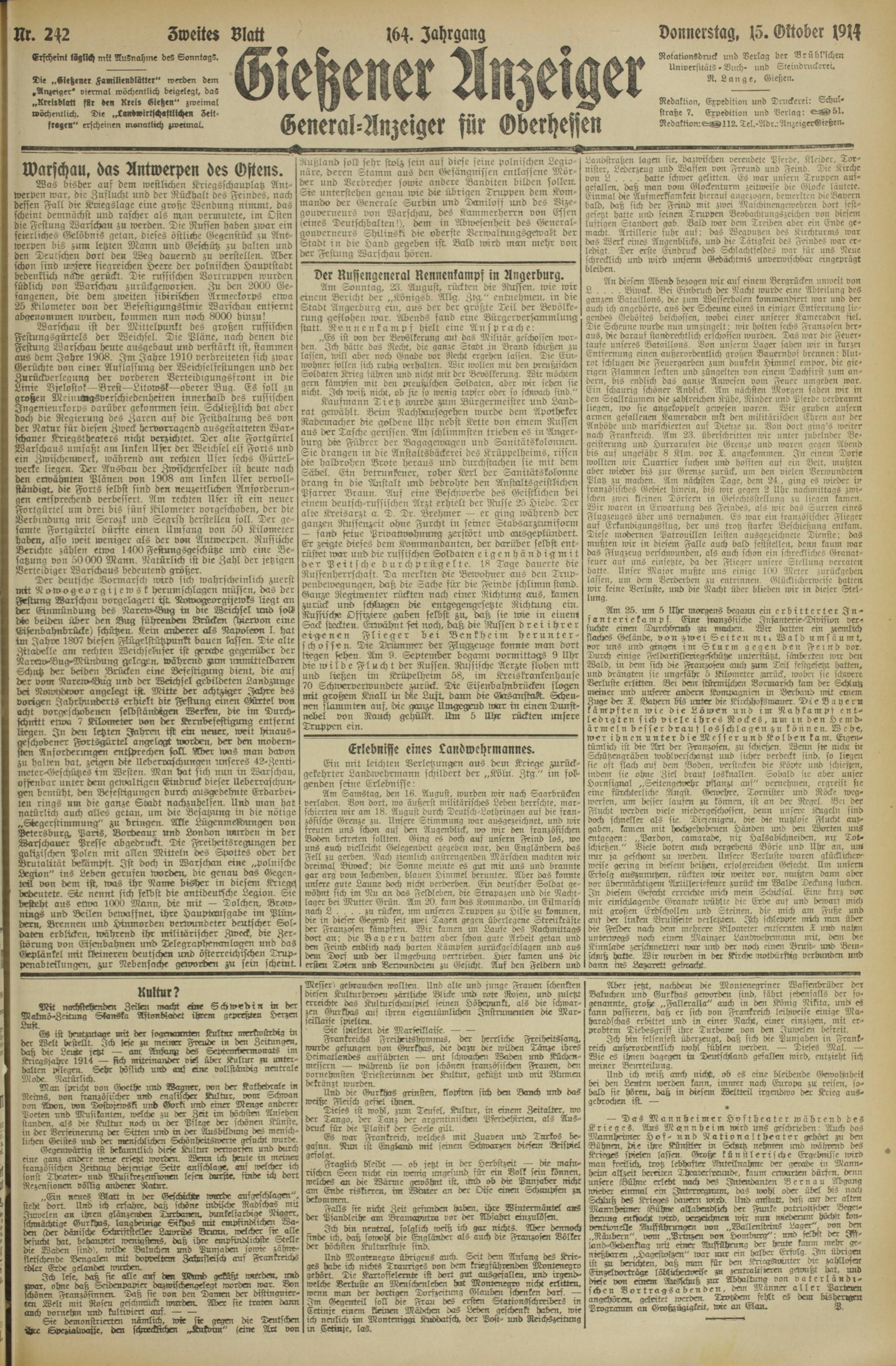 Was bisher auf dem westlichen Kriegsschauplatz Antwerpen war, die Zuflucht und der Rückhalt des Feindes, nach dessen Fall die Kriegslage eine große Wendung nimmt, das scheint demnächst und rascher als man vermutete, im Osten die Festung Warschau zu werden. Die Russen haben zwar ein feierliches Gelöbnis getan, dieses östliche Gegenstück zu And- werpcn bis zum letzten Mann und Geschütz zu Hallen und den Deutschen dort den Weg dauernd zu verstellen. Aber schon sind innere siegreichen Heere der polnischen Hauptstadt bedenklich nähe gerückt. Die russischen Vortruppcn wurden südlich von Warschau zurückgeworscn. Zu den 2000 Ge- sangenen, die dem zweiten sibirischen Armeekorps etwa 25 Kilometer von der Besestigungslrnie Warschau entfernt abgenvmmen wurden, kommen nun noch 8000 hinzu!